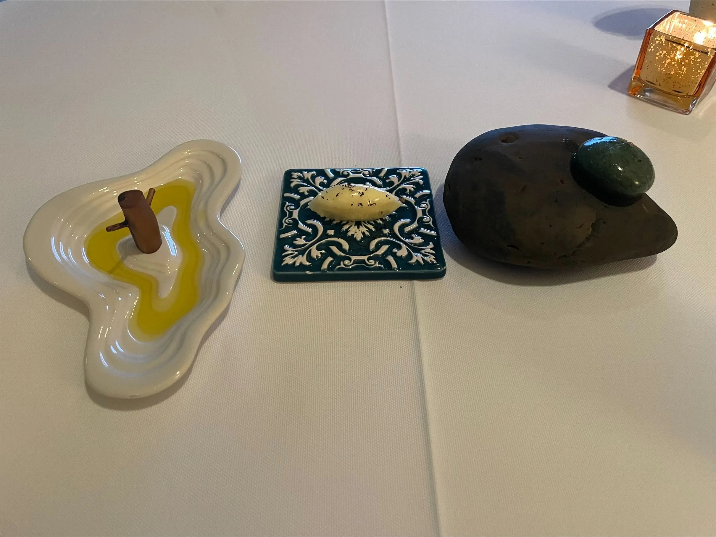 Indeed we begin with classical simplicity: excellent bread, olive oil, seaweed butter. Simple but well-executed. (7-/10)