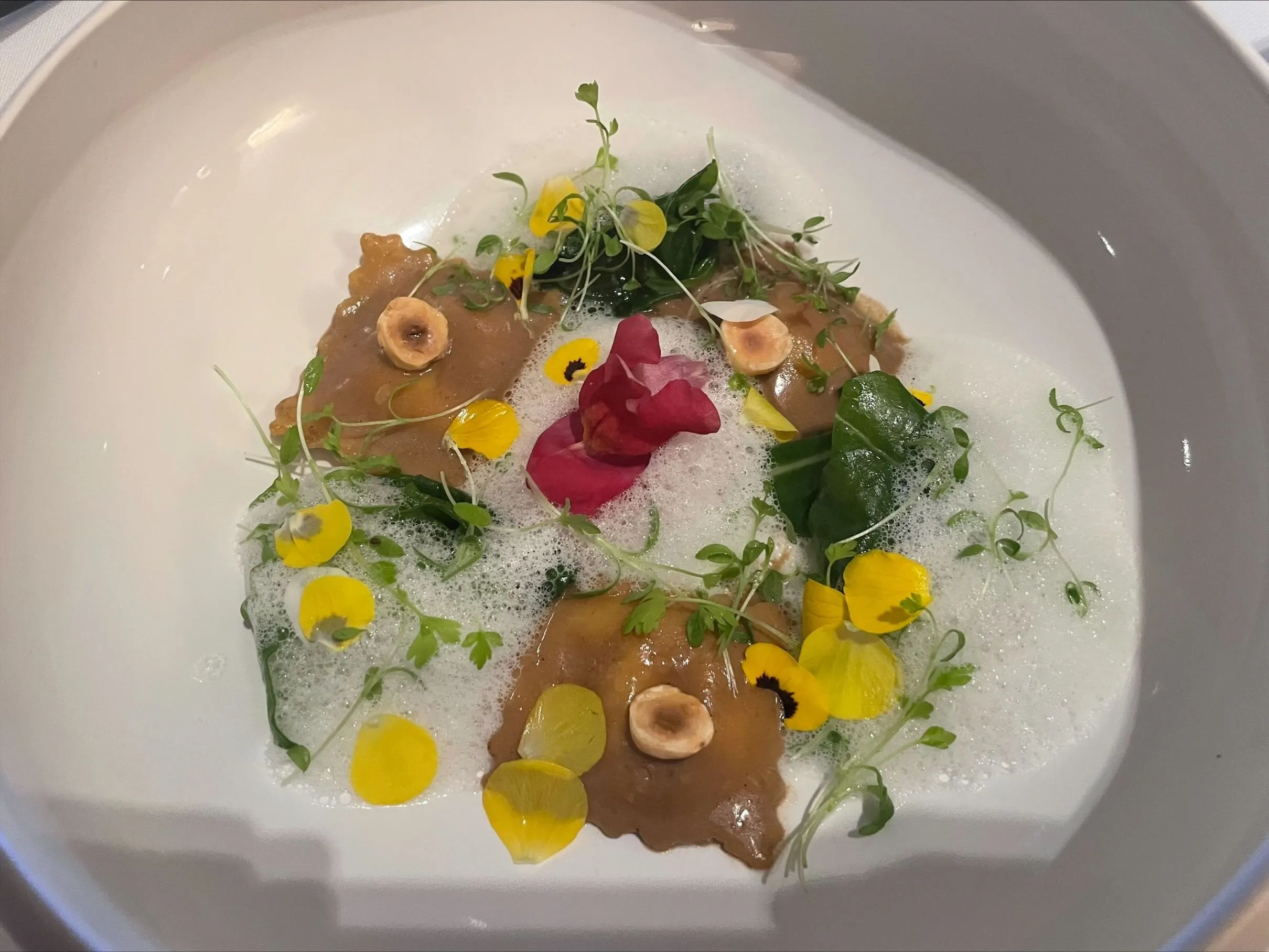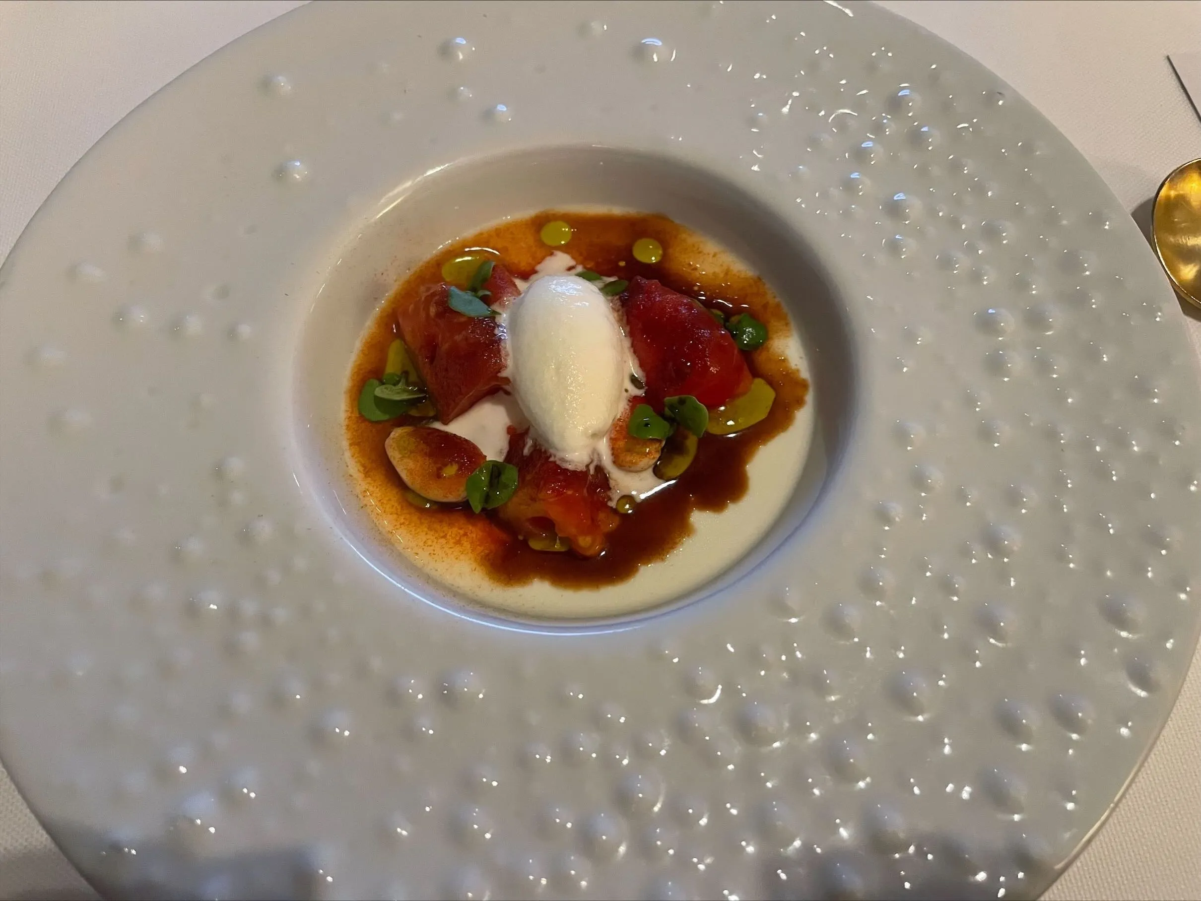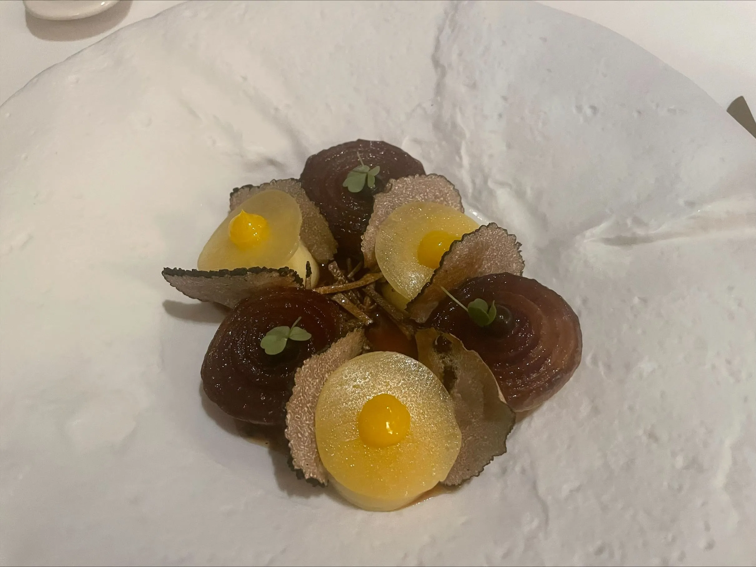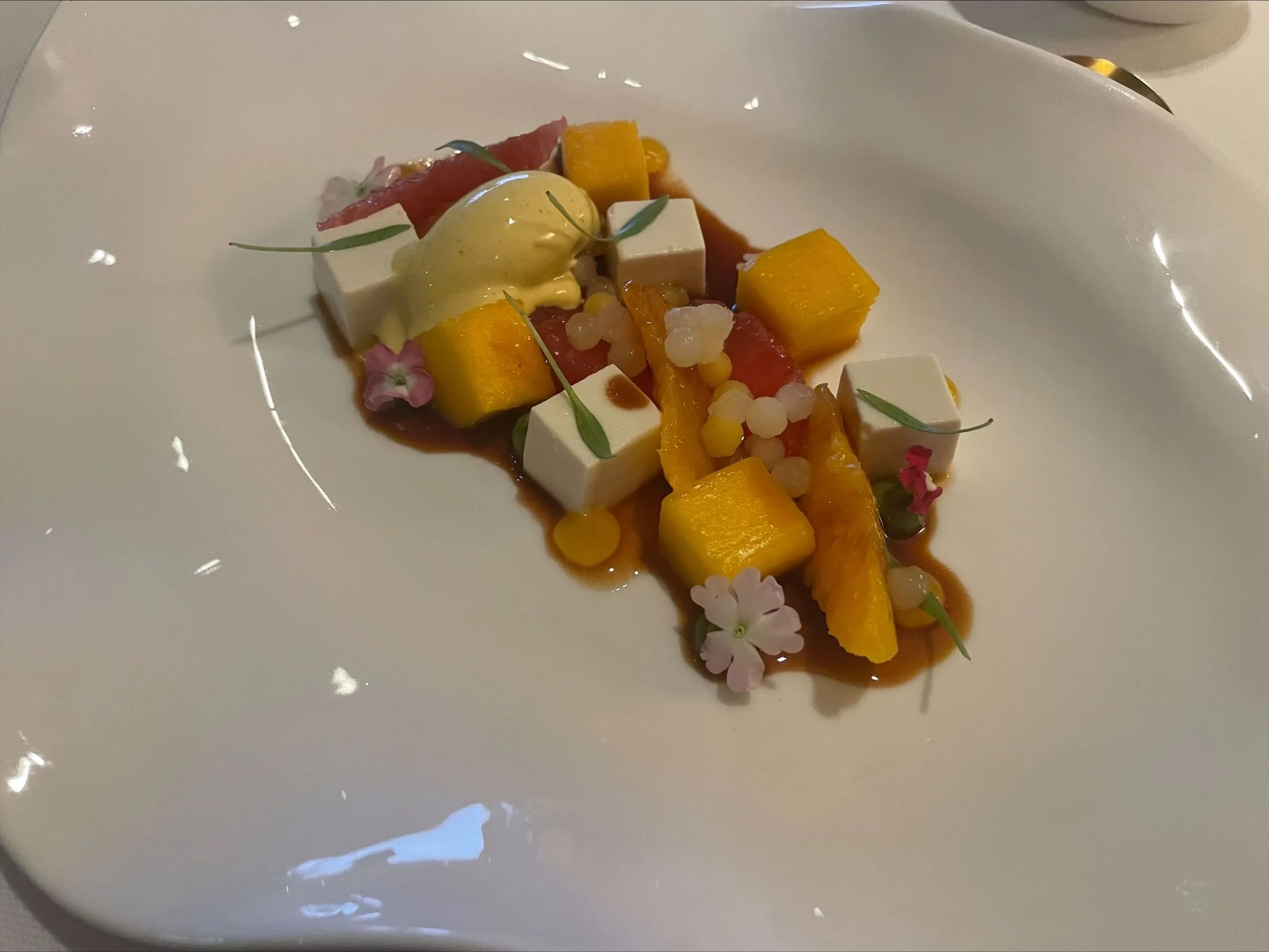 And we go right back to traditional flavor profiles, with potato, cheese, and truffle. Unfortunately, this does not match the level of execution of the previous more classic dishes: subpar truffle, cheese with an unappetizing amount of condensation on it, and potato puree that feels more like a filler than anything else leave a lot to be desired. (6/10)