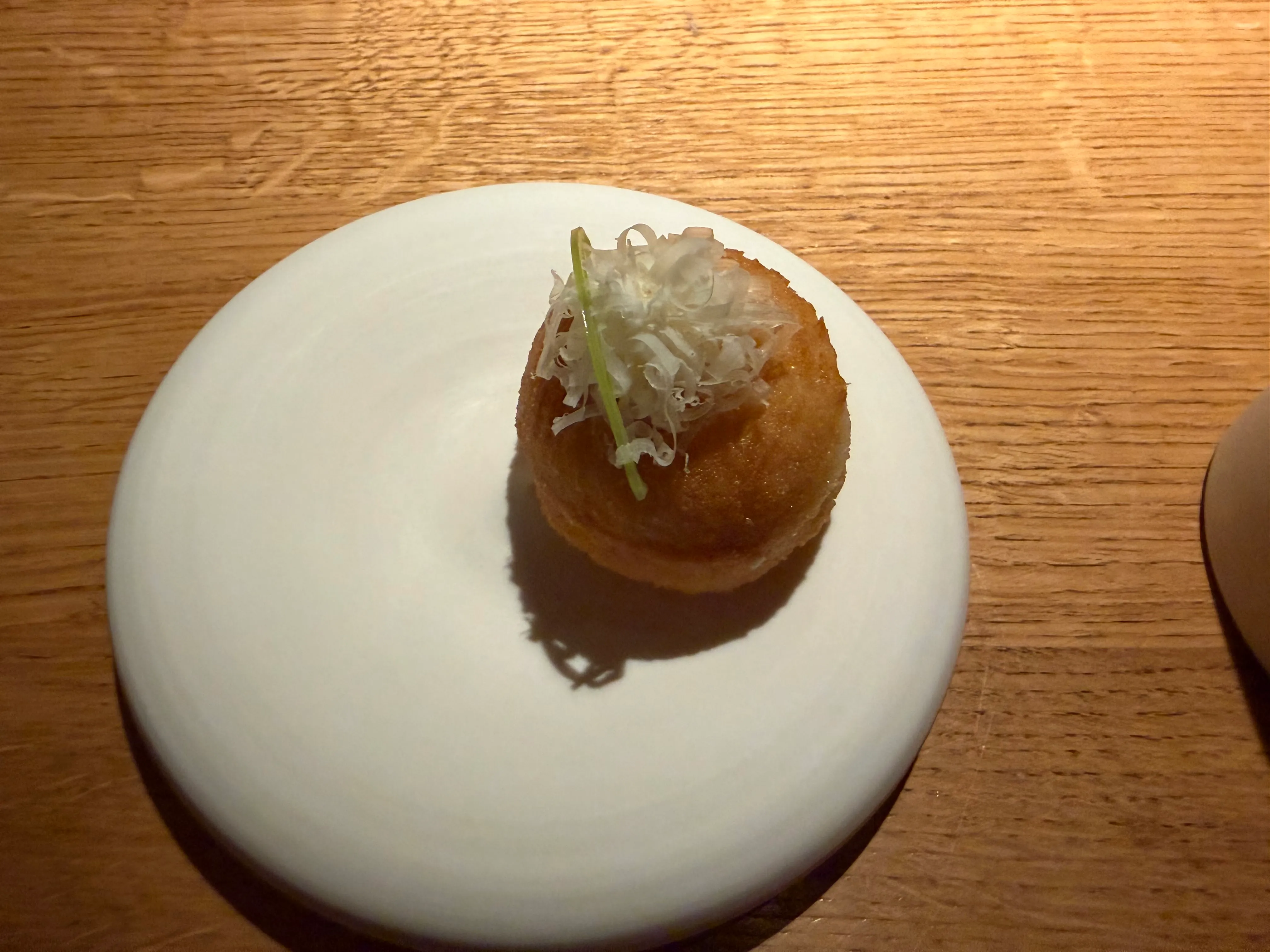 A langos, a Hungarian snack of fried dough, is served with aged mountain cheese. Fluffy, hot, greasy, and cheesy — perhaps not the most refined start to the menu, but certainly delicious. (7/10)