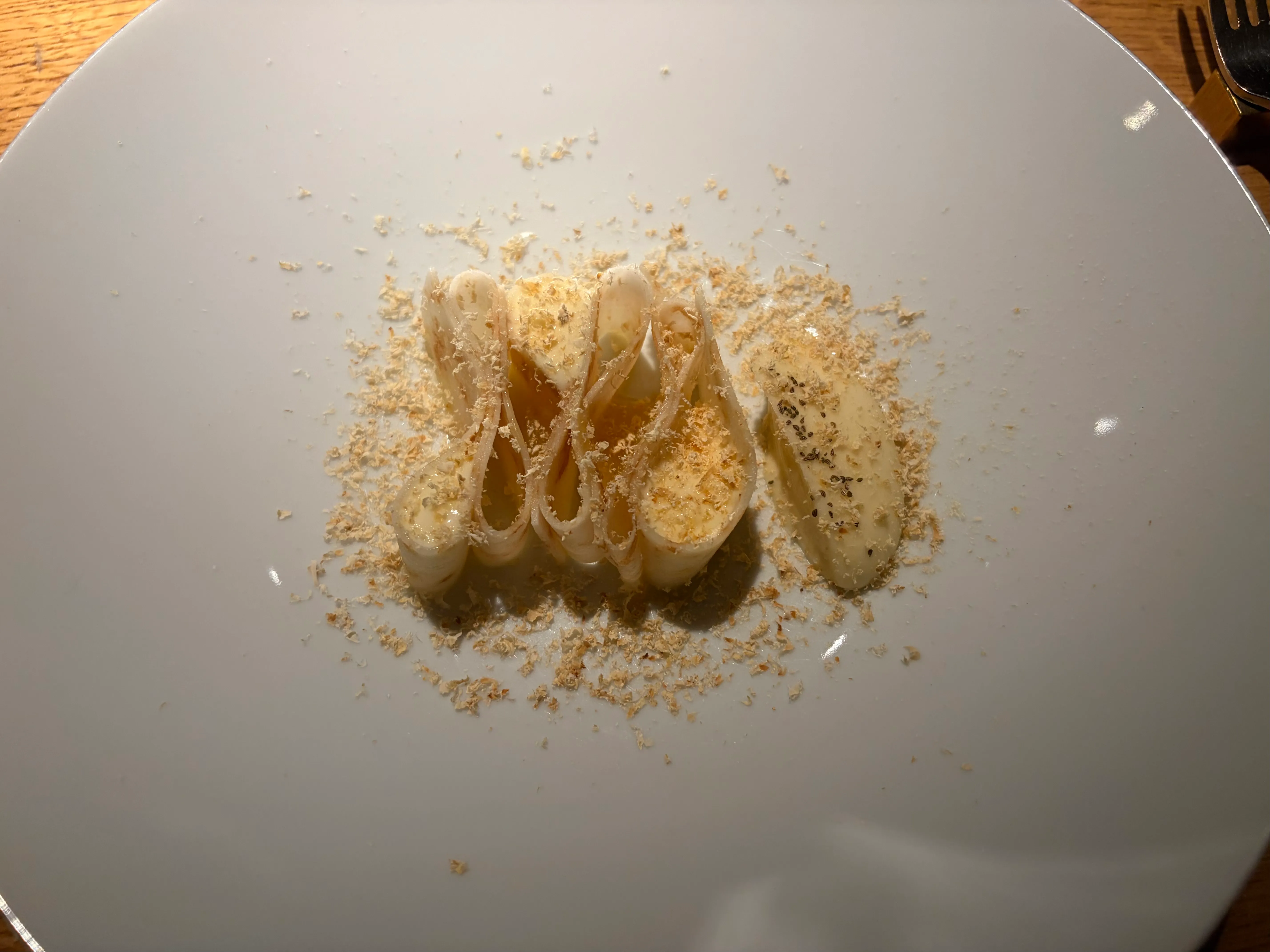 After this comforting but rather muted start, the next amuse bouche dials up the intensity. Braised leeks are paired with a reduced porcini cream and topped with an onion foam. The whole thing is, as one would expect, deliciously onion-y, but little pieces of citrus provide some welcome freshness and acidity. The salt levels are at the upper end and I would have liked a little more of the citrus, but nonetheless a promising start. (8-/10)