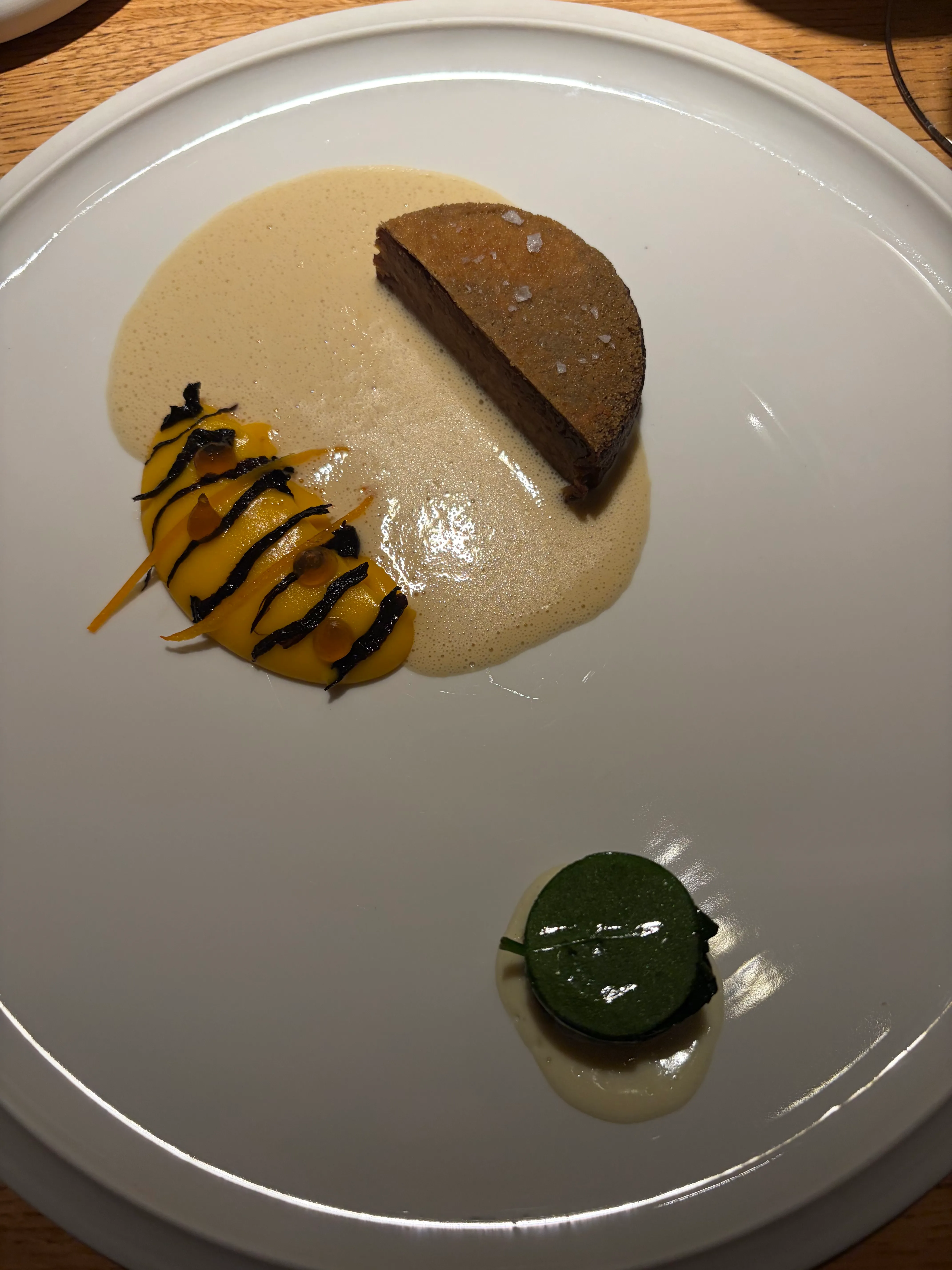 For the main course, we’re back to celeriac, which now comes baked in a dense disk, topped with a crispy yeast lid and served with pumpkin puree, spinach, and a delicious, slightly acidic sauce. Every element on this plate is perfect, and they all perfectly work together. Every flavor is dialed up to the maximum, and yet nothing clashes. One of the most perfect dishes I have ever tried. (10/10)
