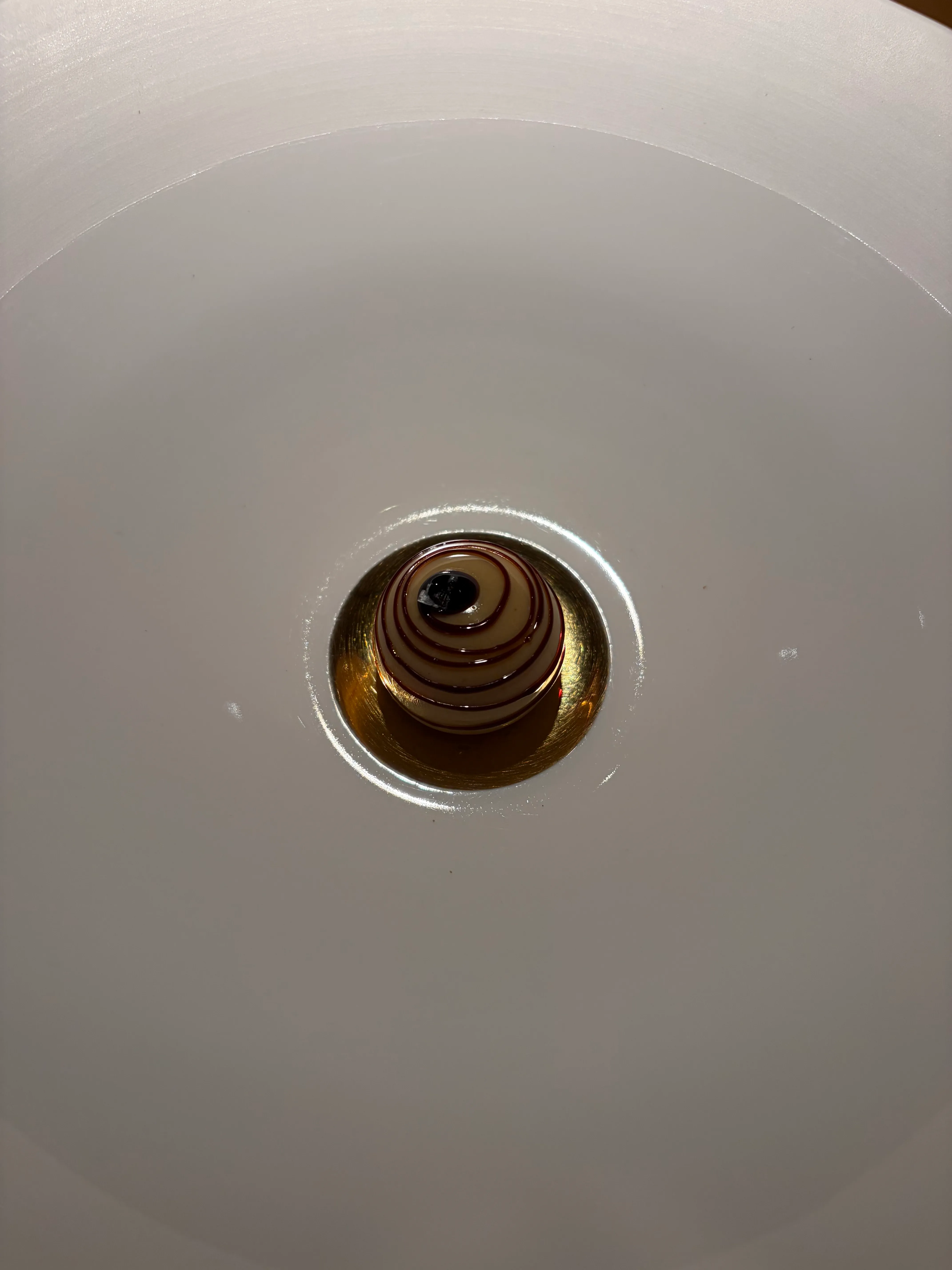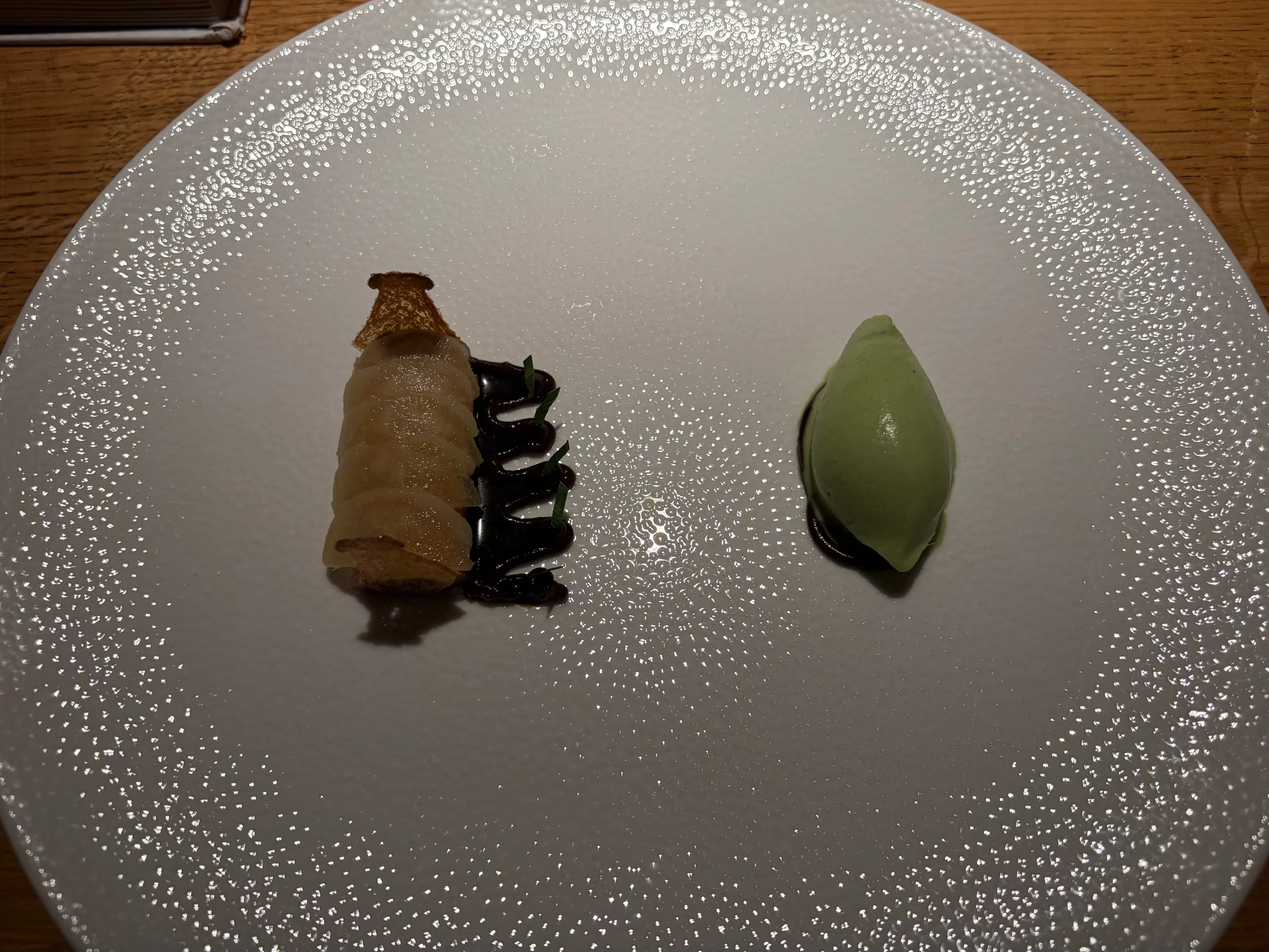 The next dish is simply titled “pickles”, but looks much more like a piece of abstract art than a jar of pickled cucumbers. The flavors are just as precise as the presentation: various ingredients having been pickled (hardly a surprise), but a celery sorbet in the middle adds enough freshness and sweetness that the dish feels well-balanced and beautifully complex instead of repetitively acidic. (9/10)