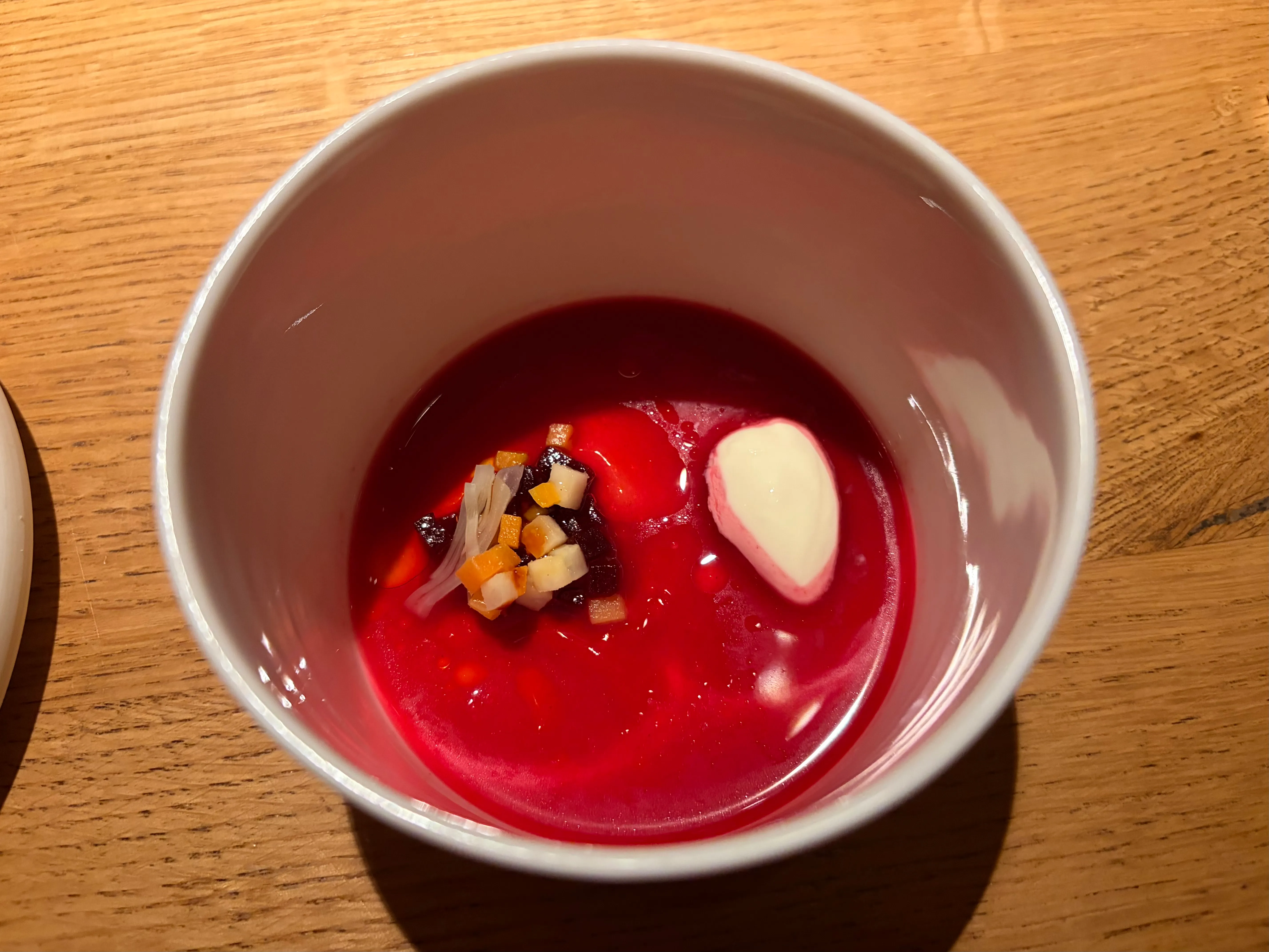 A modern interpretation of borscht is pretty mild, but the bell pepper-based broth has an interesting floral aroma. (8/10)