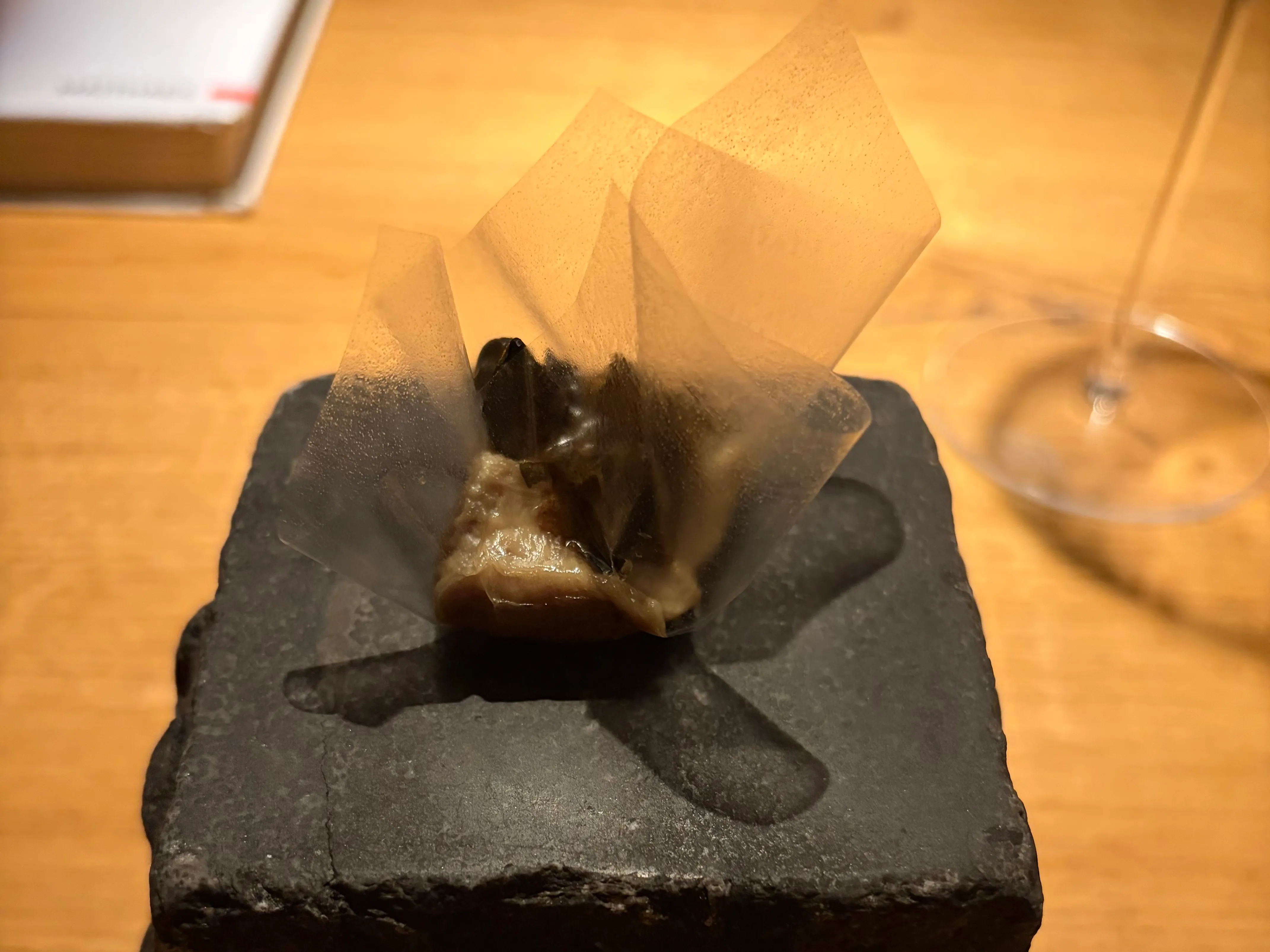The next dish is titled mushroom kidney. Similar to the mushroom foie gras at the start, I cannot compare this to the animal-based version, but it sure is delicious: fried mushroom, apple gel, an umami broth, and a straw made from celeriac (?) that adds a surprising amount of flavor and texture. (8+/10)