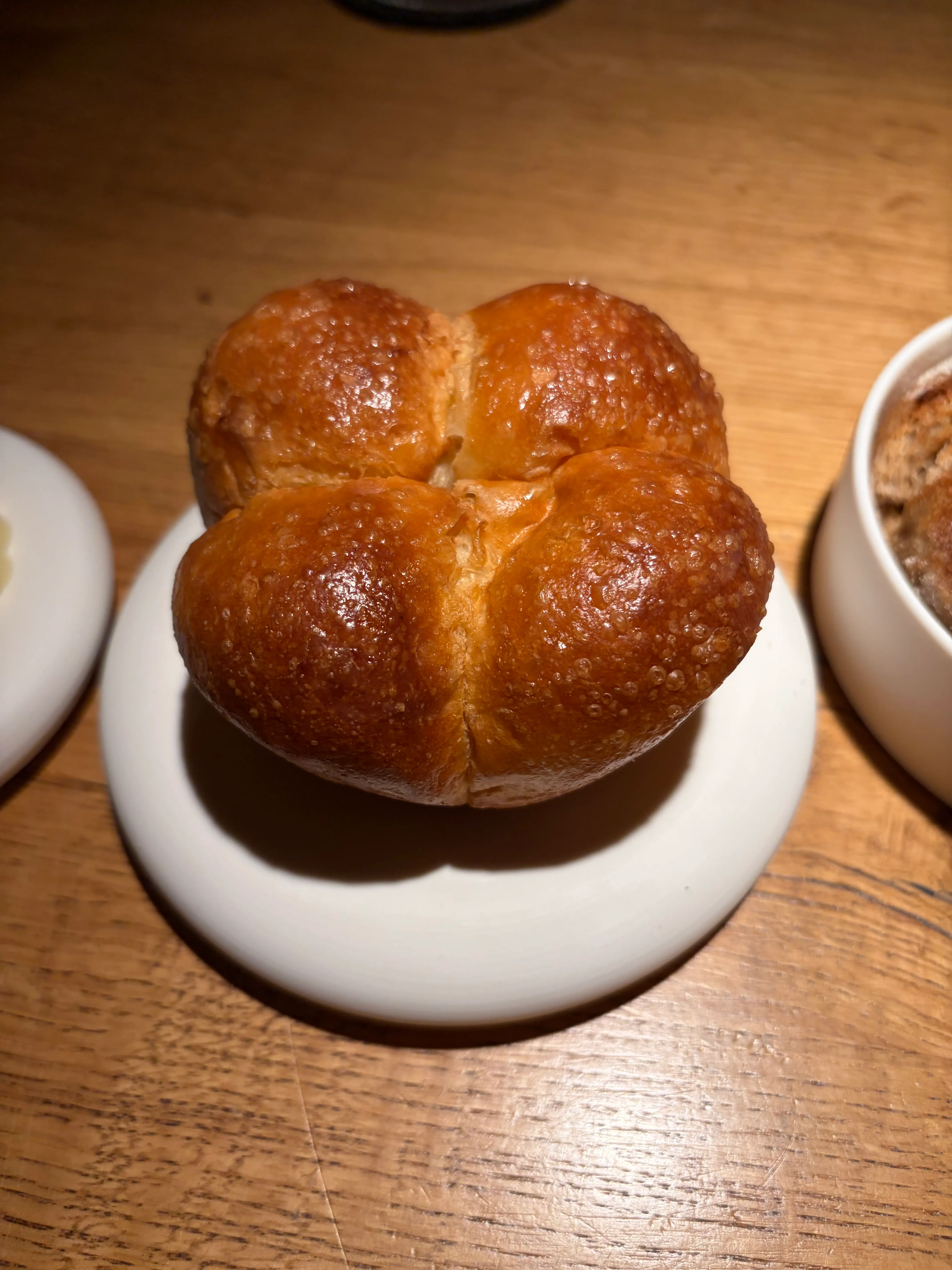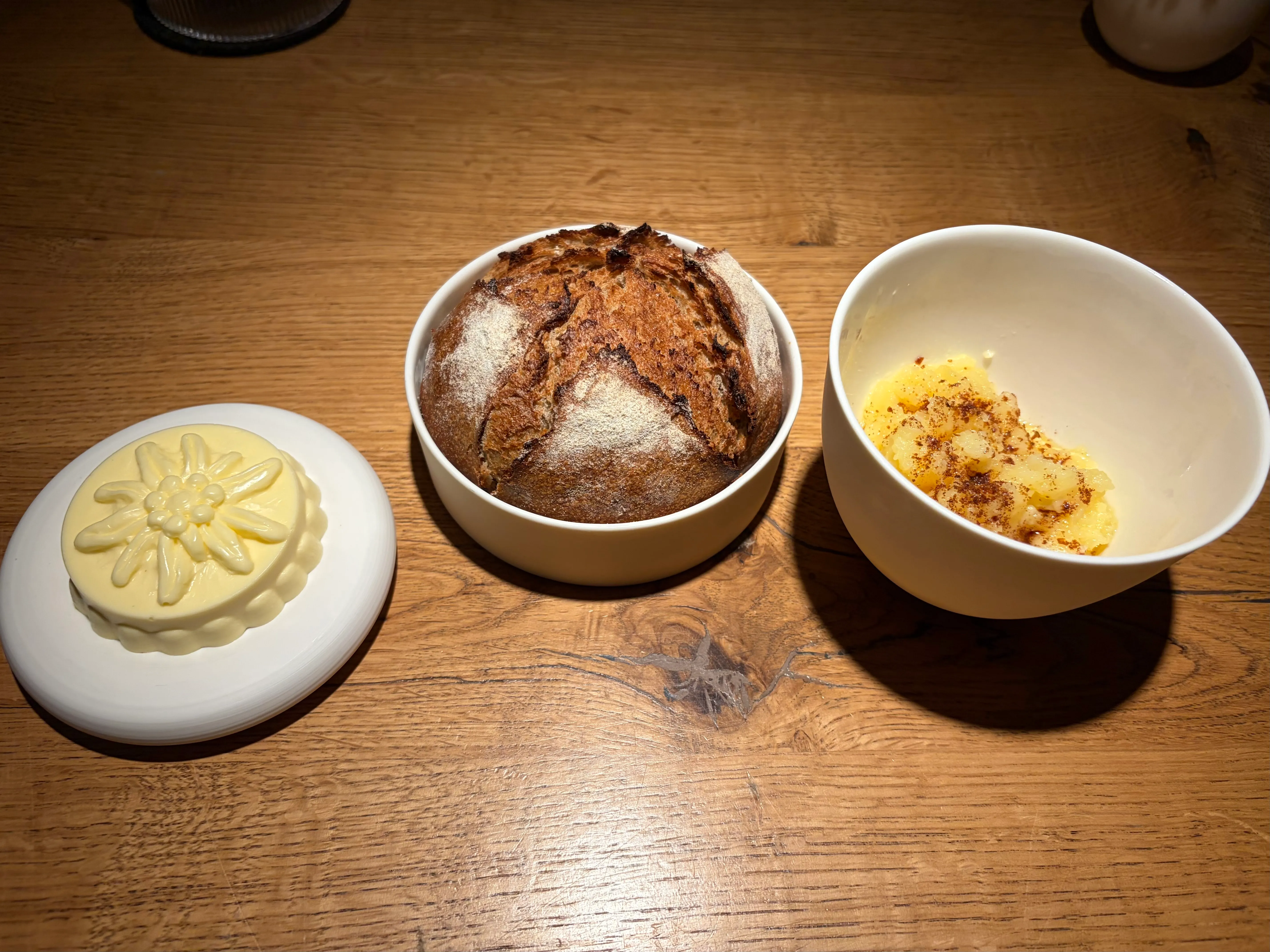 The bread is an excellent sourdough bread, served with good butter and, surprisingly, coarsely mashed potato. I’m a little confused by the potato (Do I put it on the bread? That’s carbs on carbs. Do I eat it straight? That’s very filling.) and given my lukewarm feelings about the ingredient itself, mostly stick to the very good bread. (7/10)