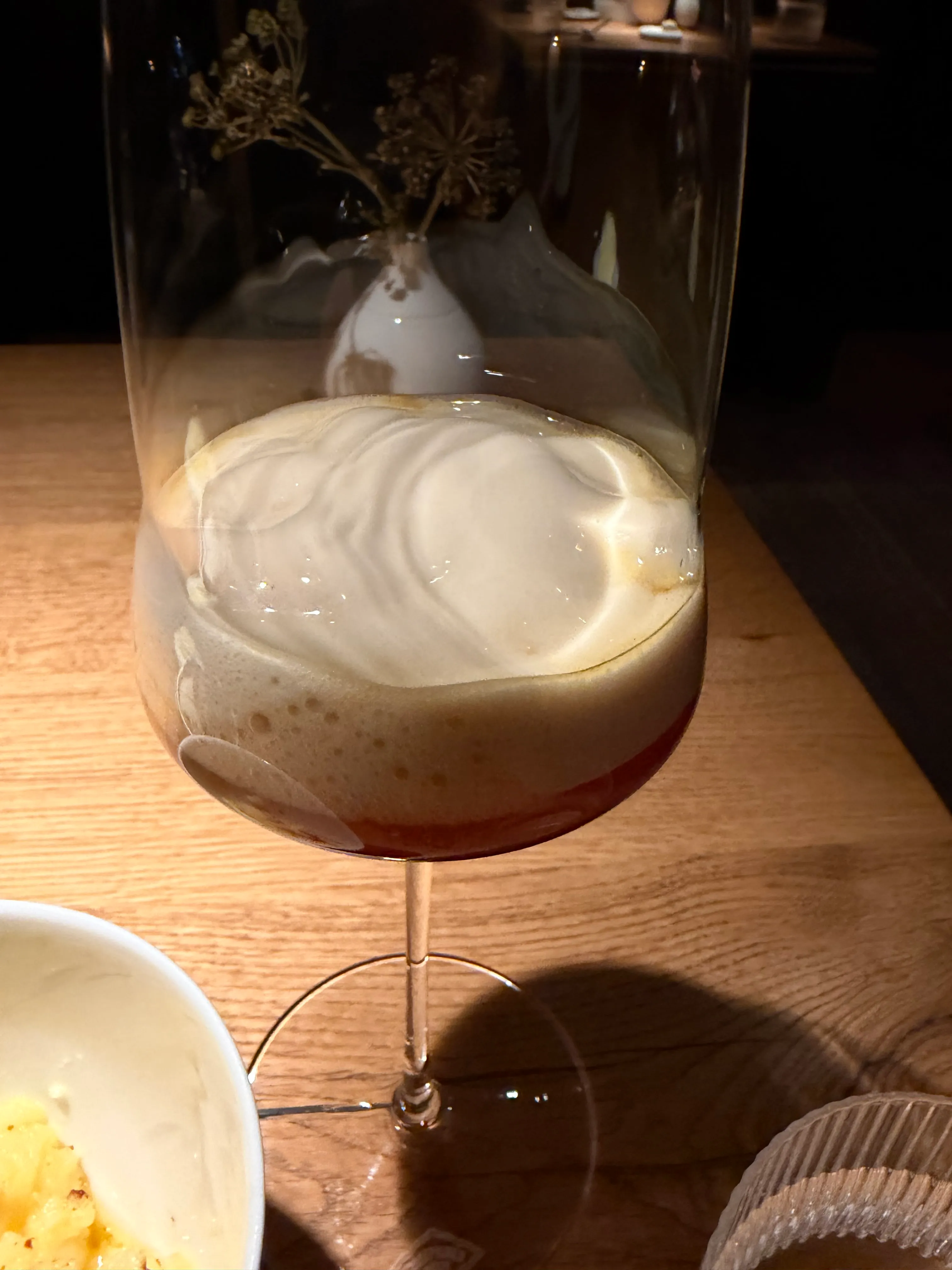 The foie gras is paired with a juice made from roasted root vegetables topped with malt beer foam. This is a stunning creation, capturing all the wholesome richness of a bowl of roasted carrots in a cool, clean drink. Very memorable. (10/10)