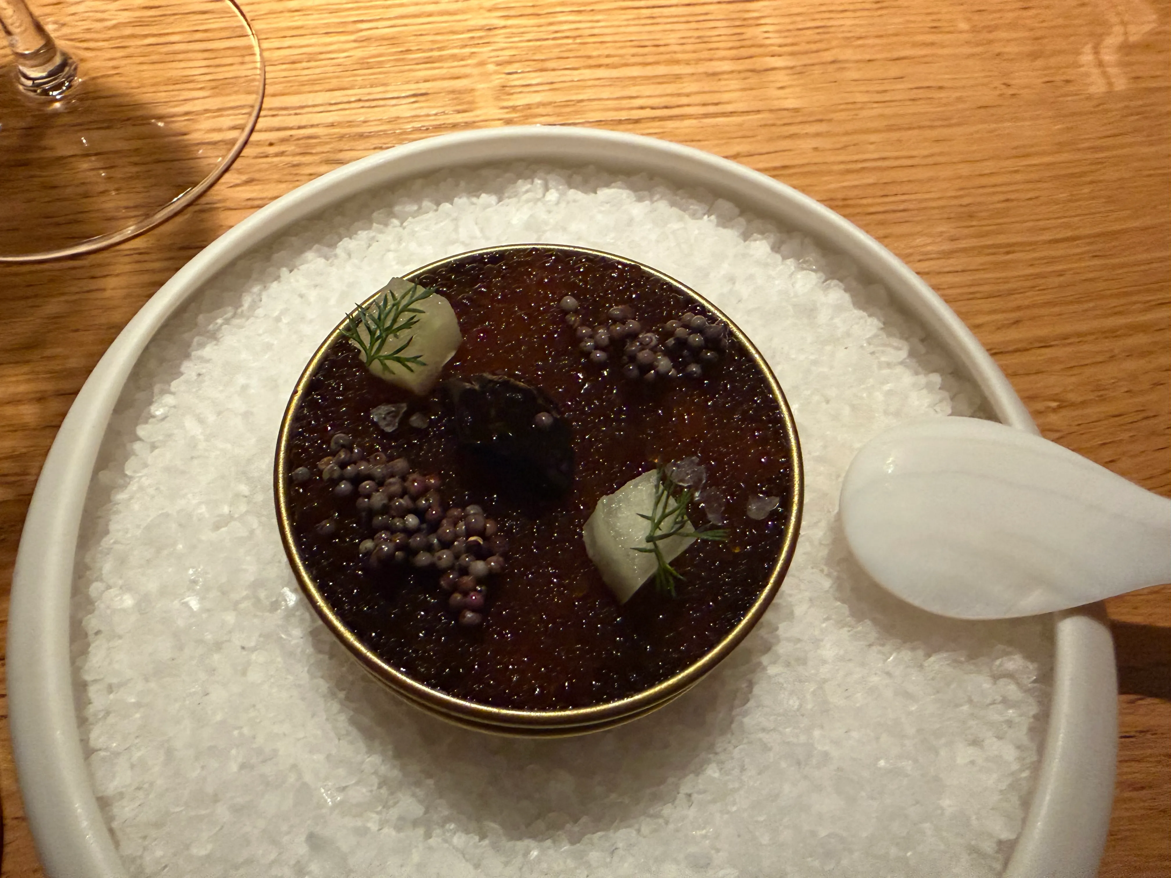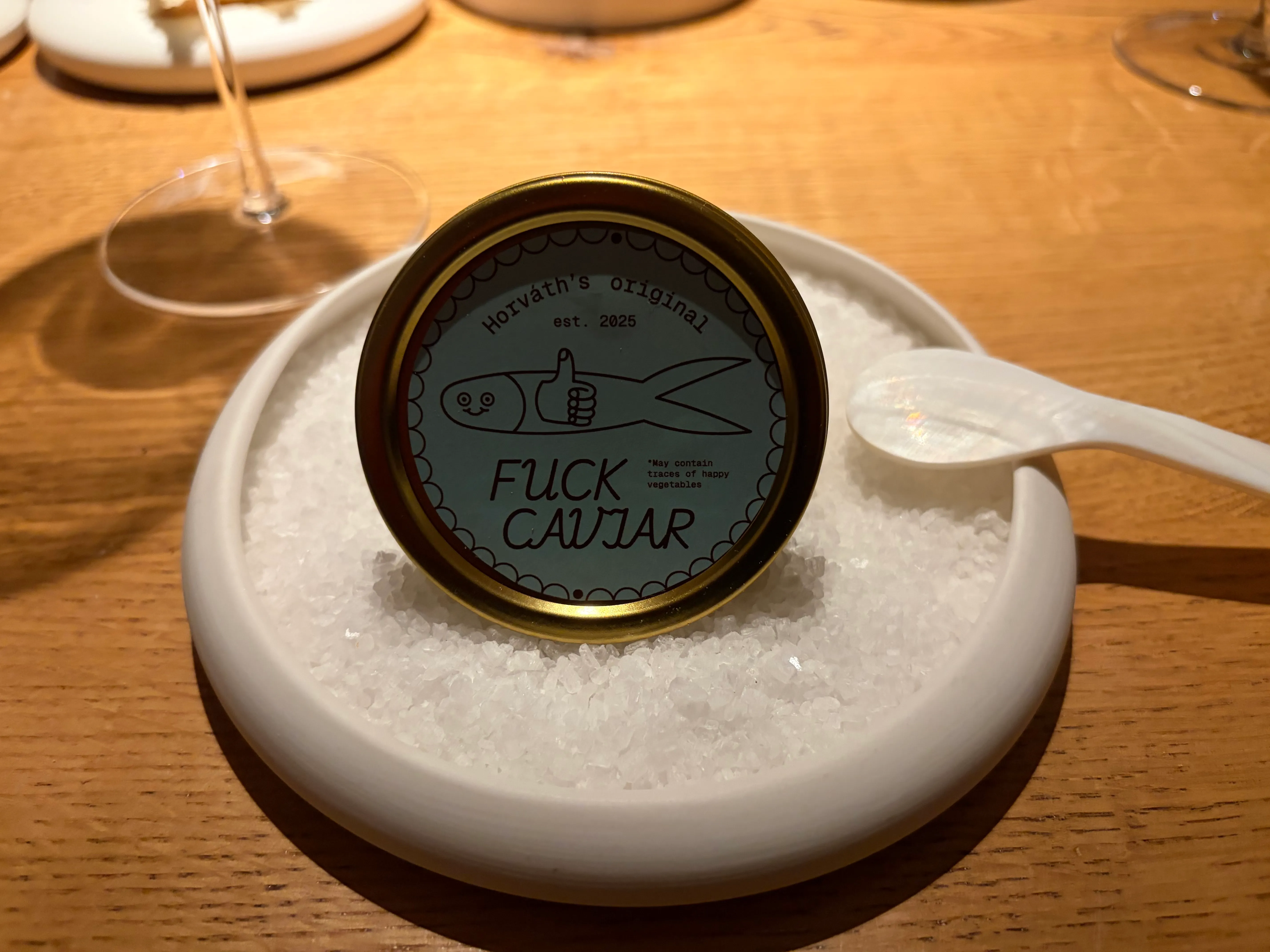 The next course is named, rather unsubtly, f**k caviar. The service explains that this is not born out of a hatred of the ingredient, but because they feel that caviar (much like foie gras, wagyu, langoustines, etc) is used as a generic “fancy ingredient” in fine dining restaurants around the world. Instead, their idea of fine dining means labour intensive preparations, not expensive bought-in ingredients.