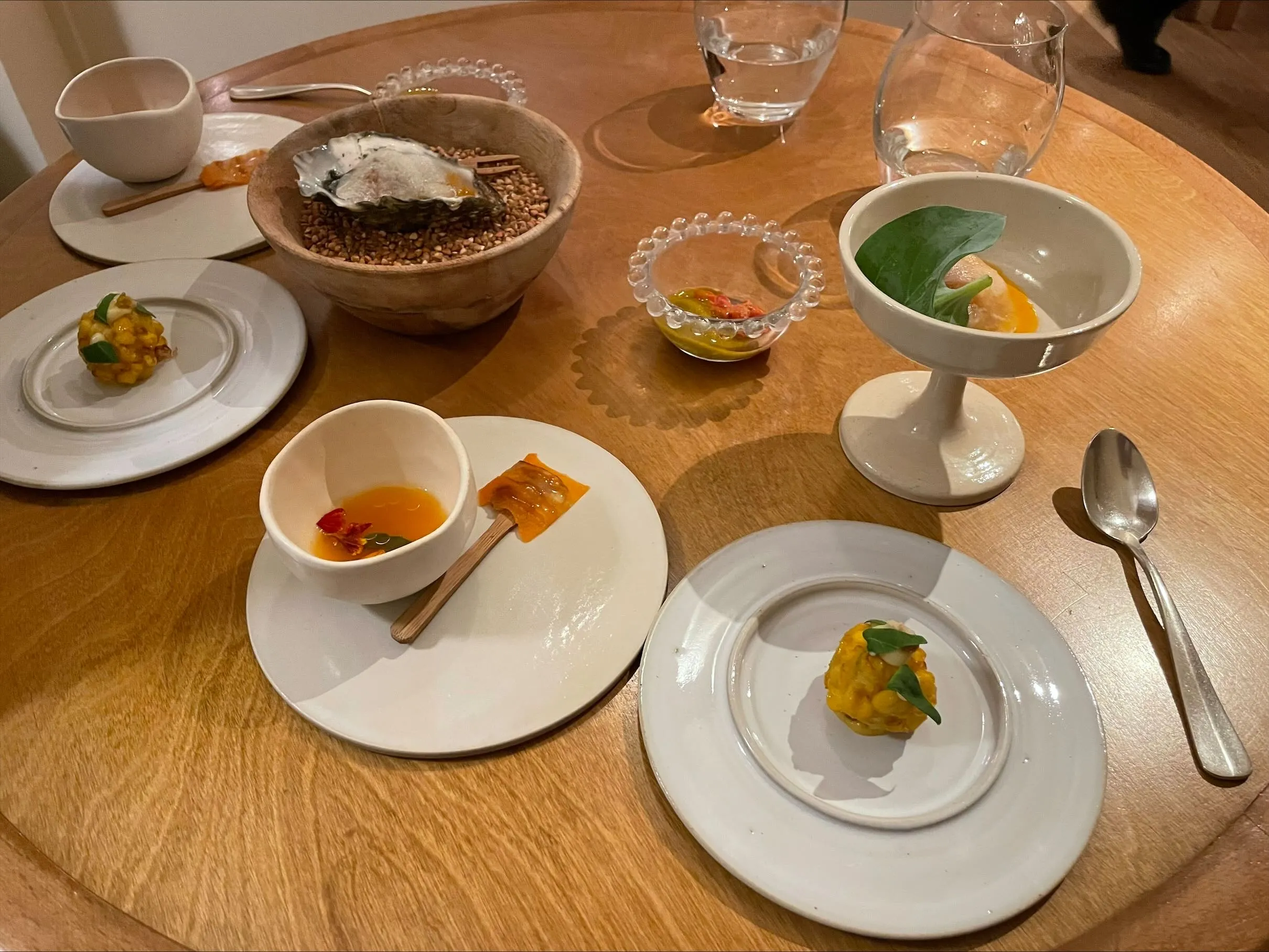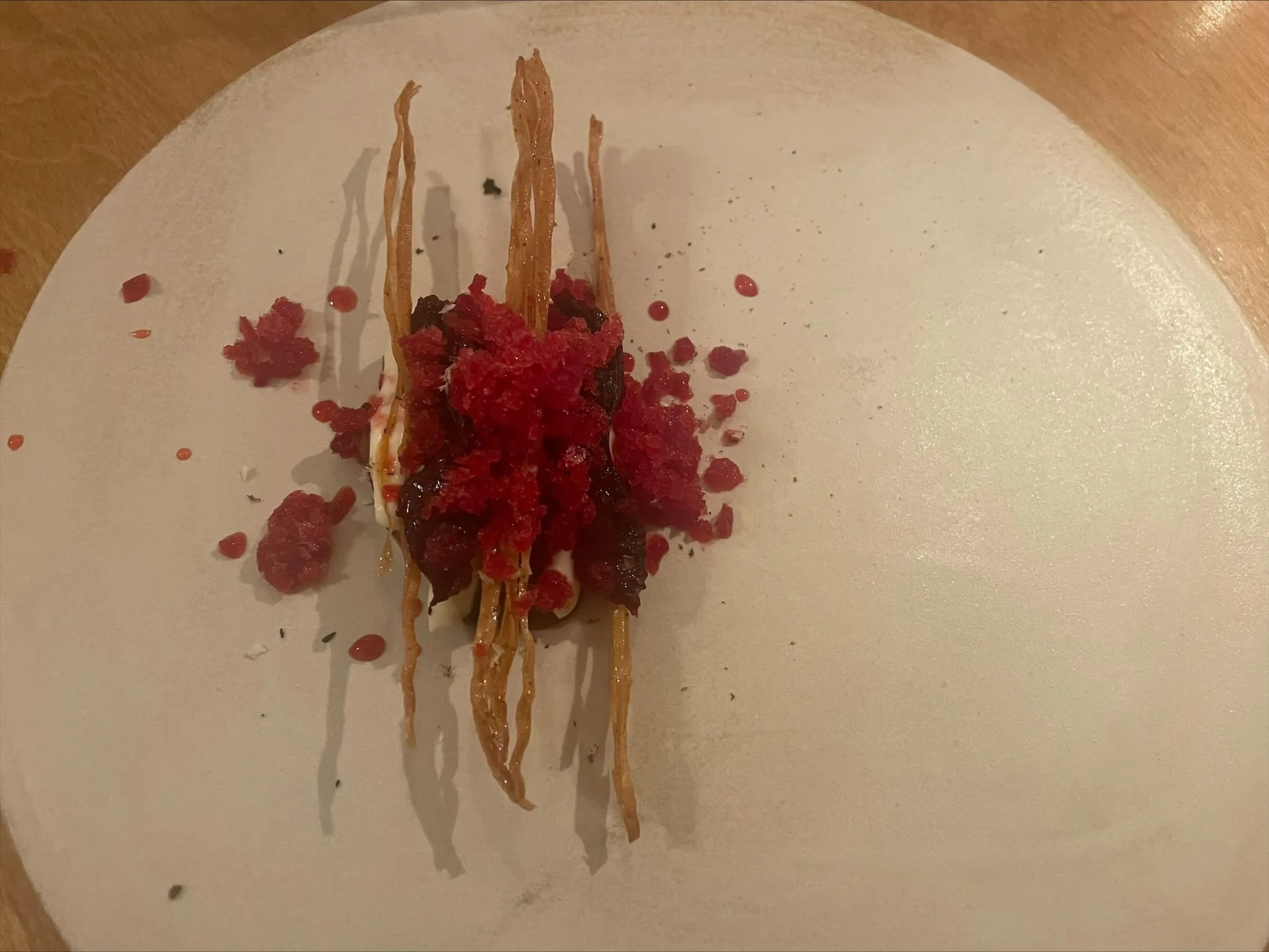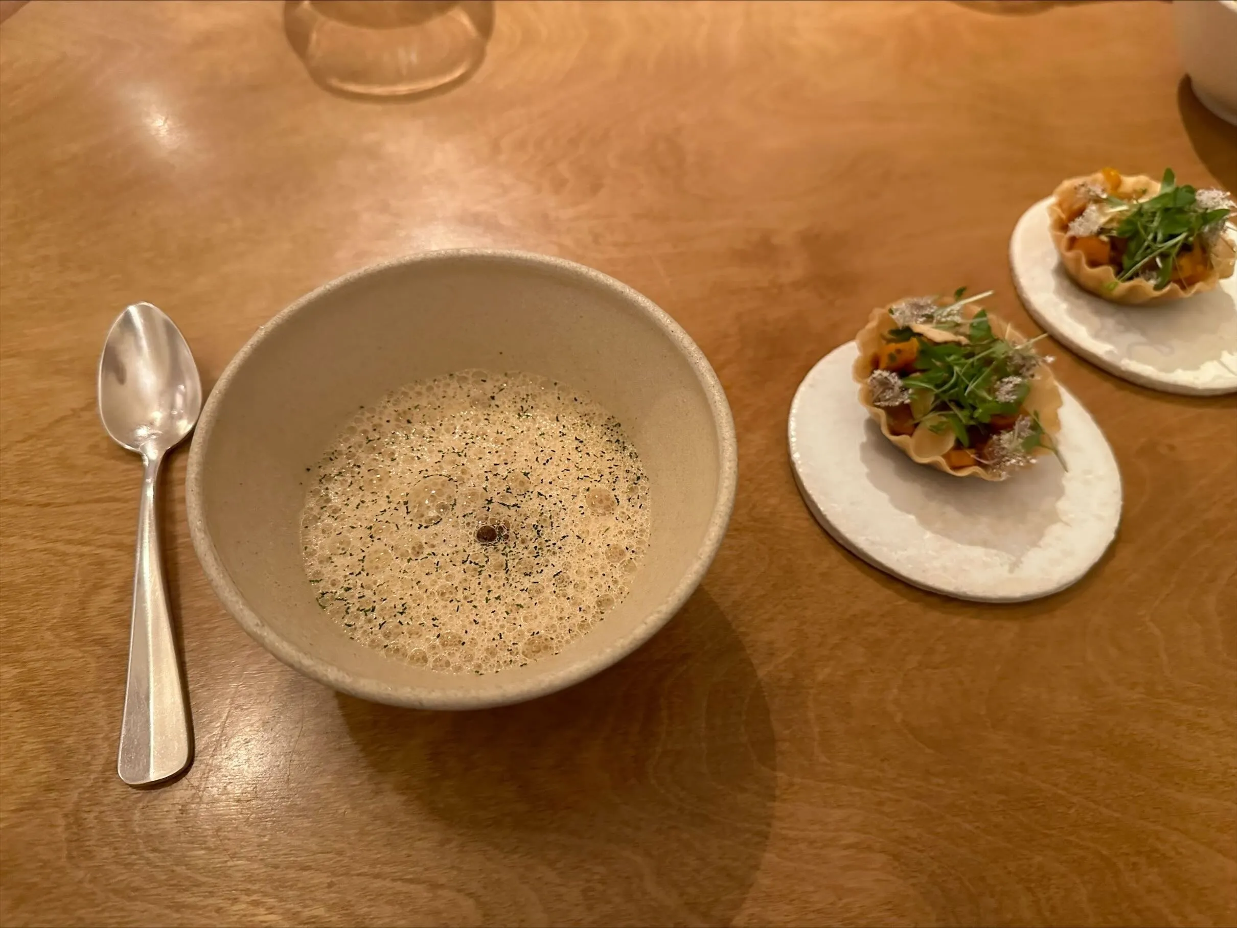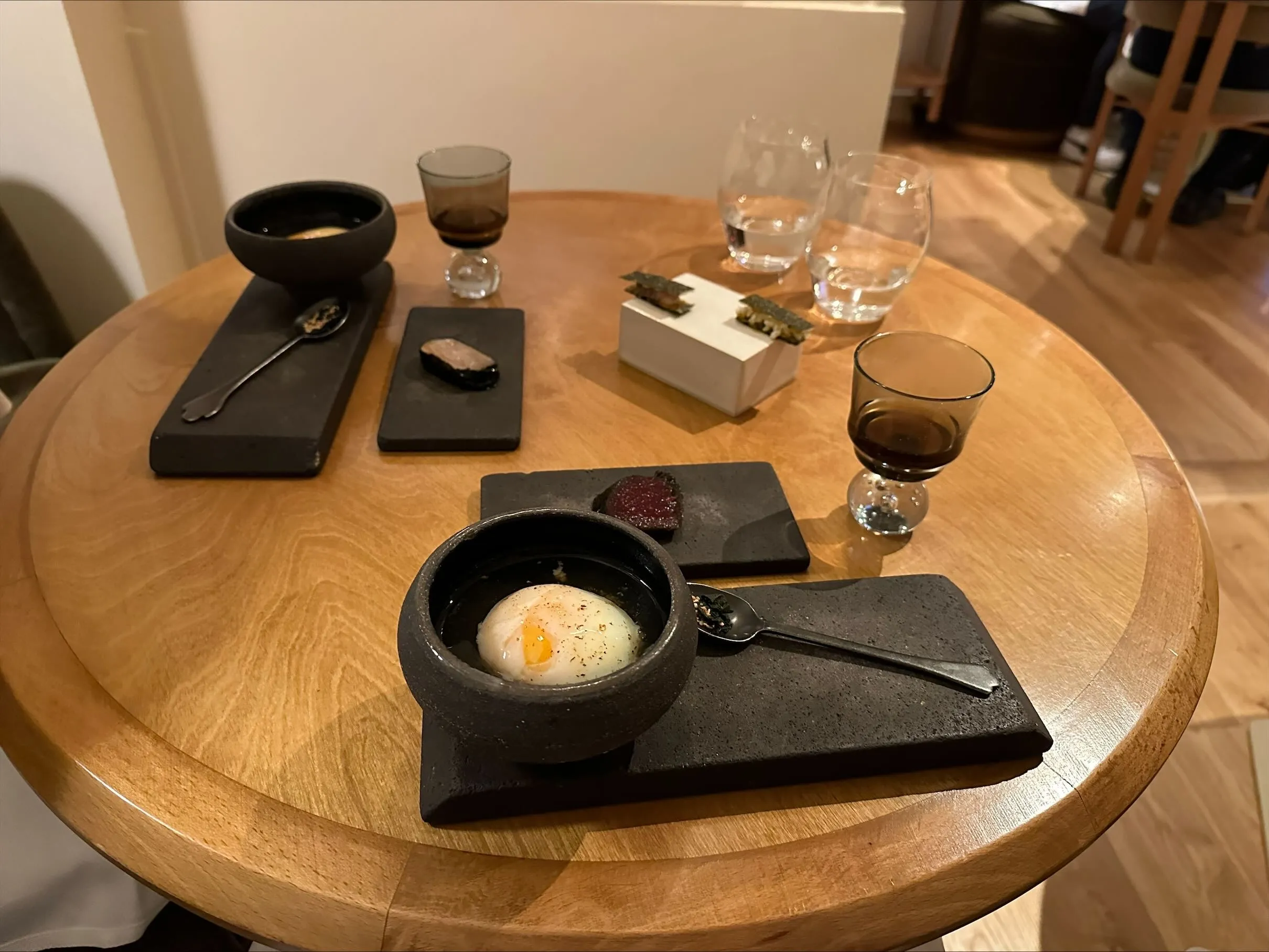 The first set of snacks is decidedly Japanese: an onsen egg is well-cooked but fairly bland and a strangely substantial portion as a starting snack. A shot of well-flavoured but not particularly memorable dashi is served on the side, alongside a piece of beetroot sushi and a nori cracker with puffed rice. There is little fusion here, but a lot of watered-down Japanese ideas. Still, everything is well made, and given how hungry I am, I don’t mind the substantial egg to start. (6/10)