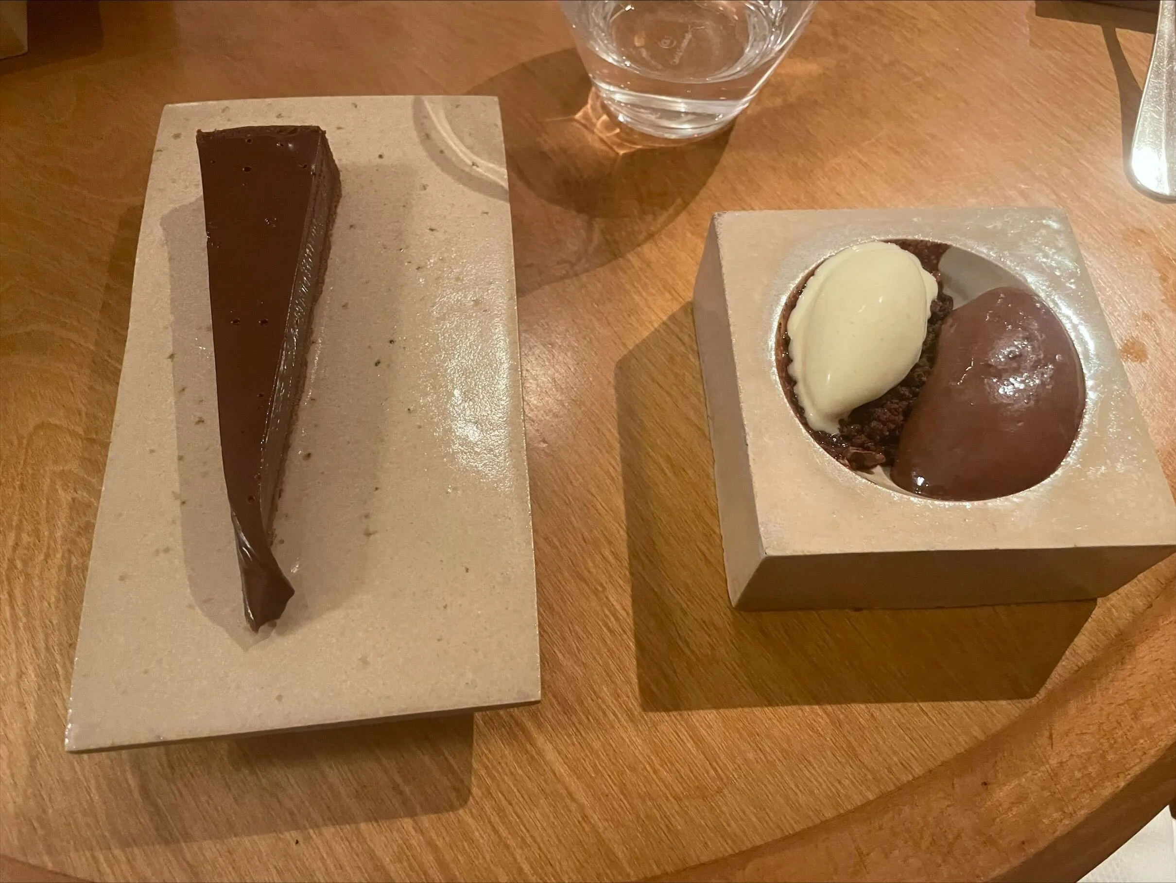 We end, classically French, with a chocolate tart. This is expertly made, deeply flavoured with high-quality chocolate, and thoroughly enjoyable. It comes with a side dish that, against all odds and common sense, strongly tastes of wasabi. I’m not a fan of wasabi or overly savoury elements in sweet desserts, so half a spoonful convinces me to focus entirely on the excellent tart. (7+/10)