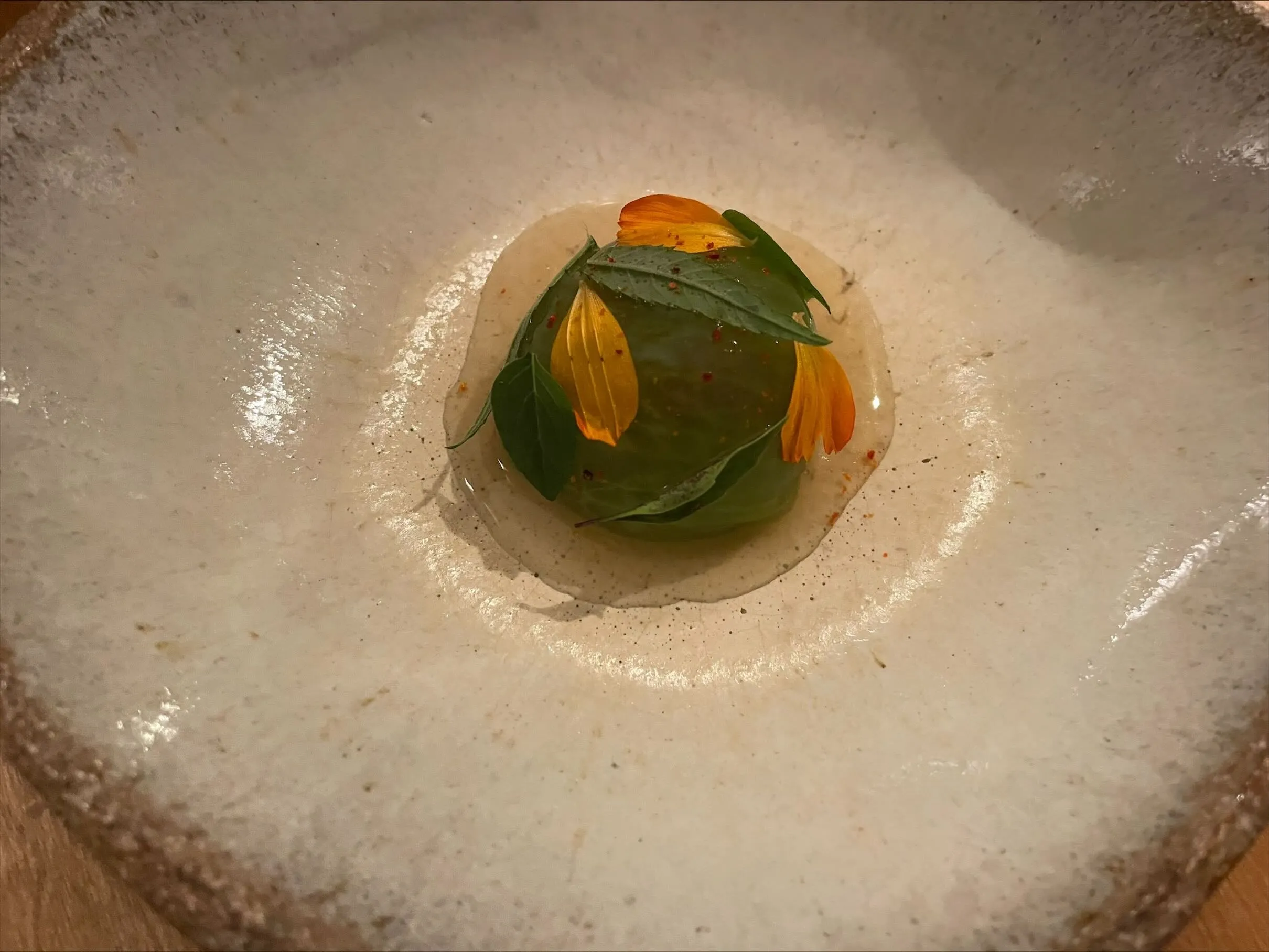 The first proper course is a green tomato with a sauce from Benin, which sadly fails to leave any impression on me. (6/10)