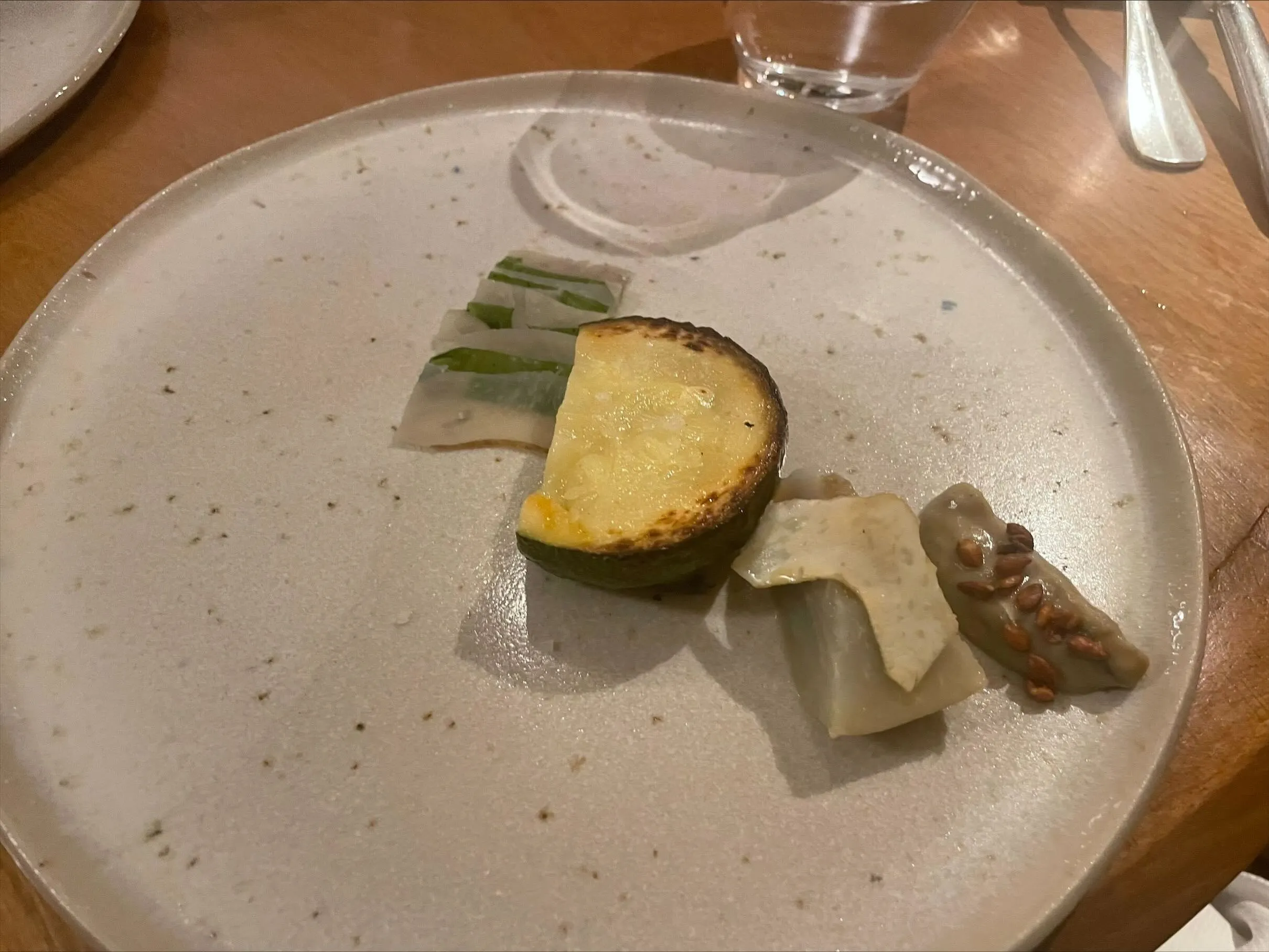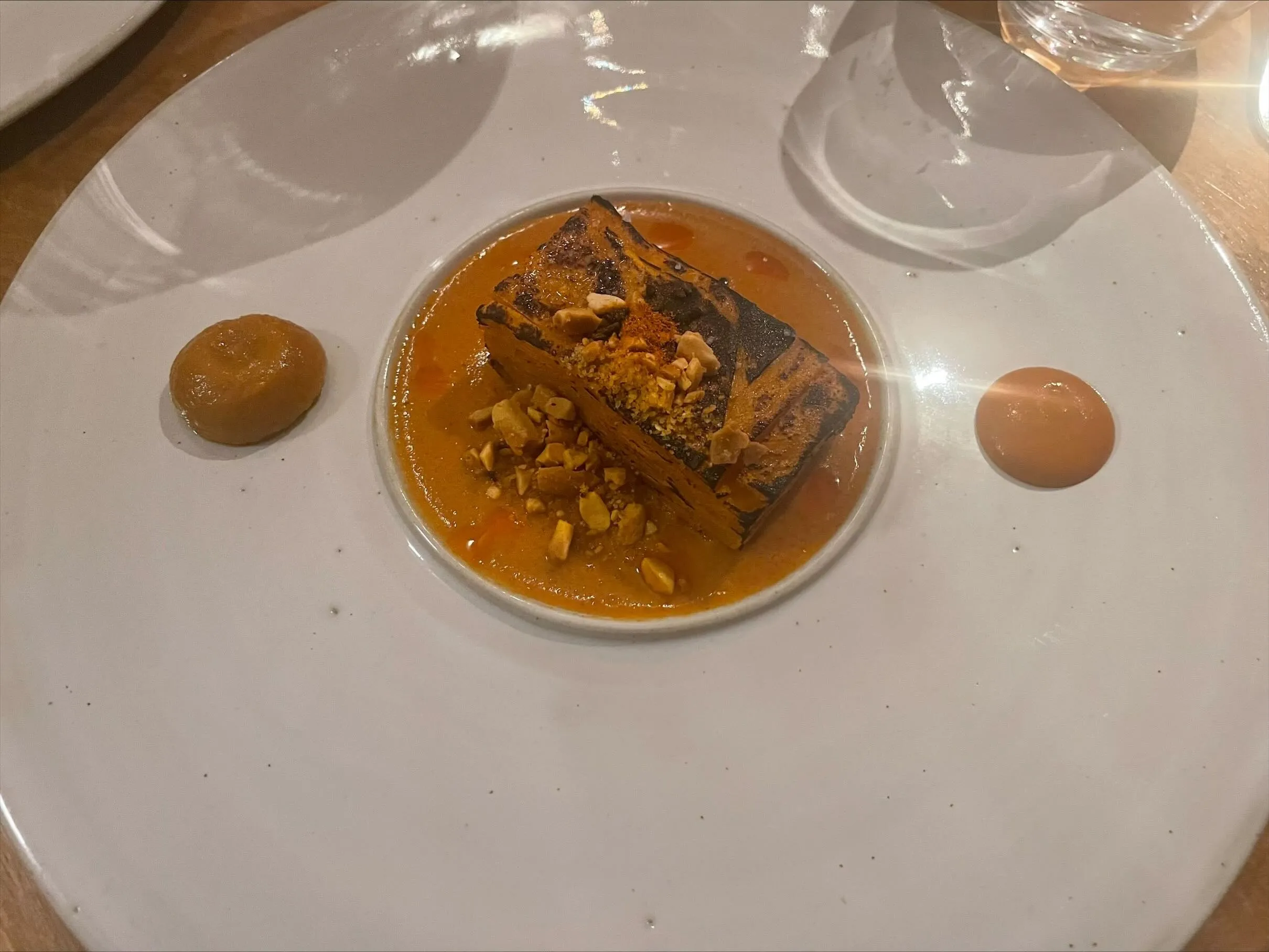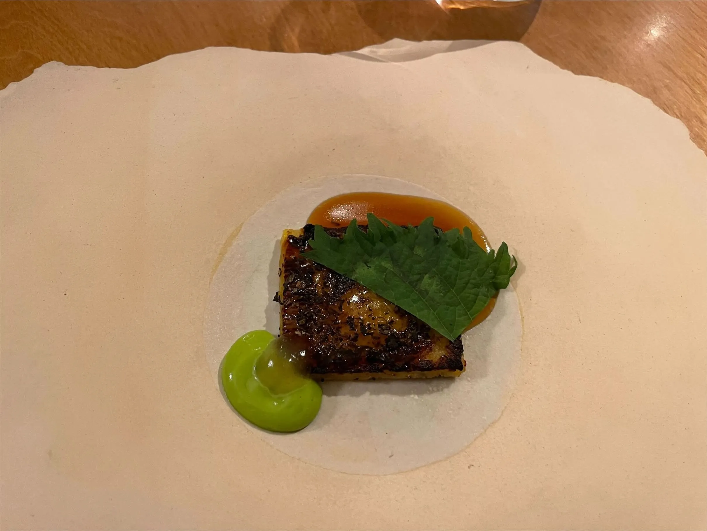 The restaurant is modern and welcoming, furnished in a relaxed French-Japandi style. The staff often struggled with English, but in a good-natured, charming way that I associate more with Italy than France. All set then for the main attraction: Sacko’s cuisine, which draws on his family’s roots in Senegal and Mali and his personal interest in Japan, grounded in solid French technique. This, in fact, was my main reason for coming — West African cuisine is rare in all of Europe, but West African-Japanese-French fusion is probably unique, certainly at a Michelin-starred level. This is offered as a no-choice tasting menu with a vegetarian option on request. I’m intrigued, excited, and hungry; an ideal setup.