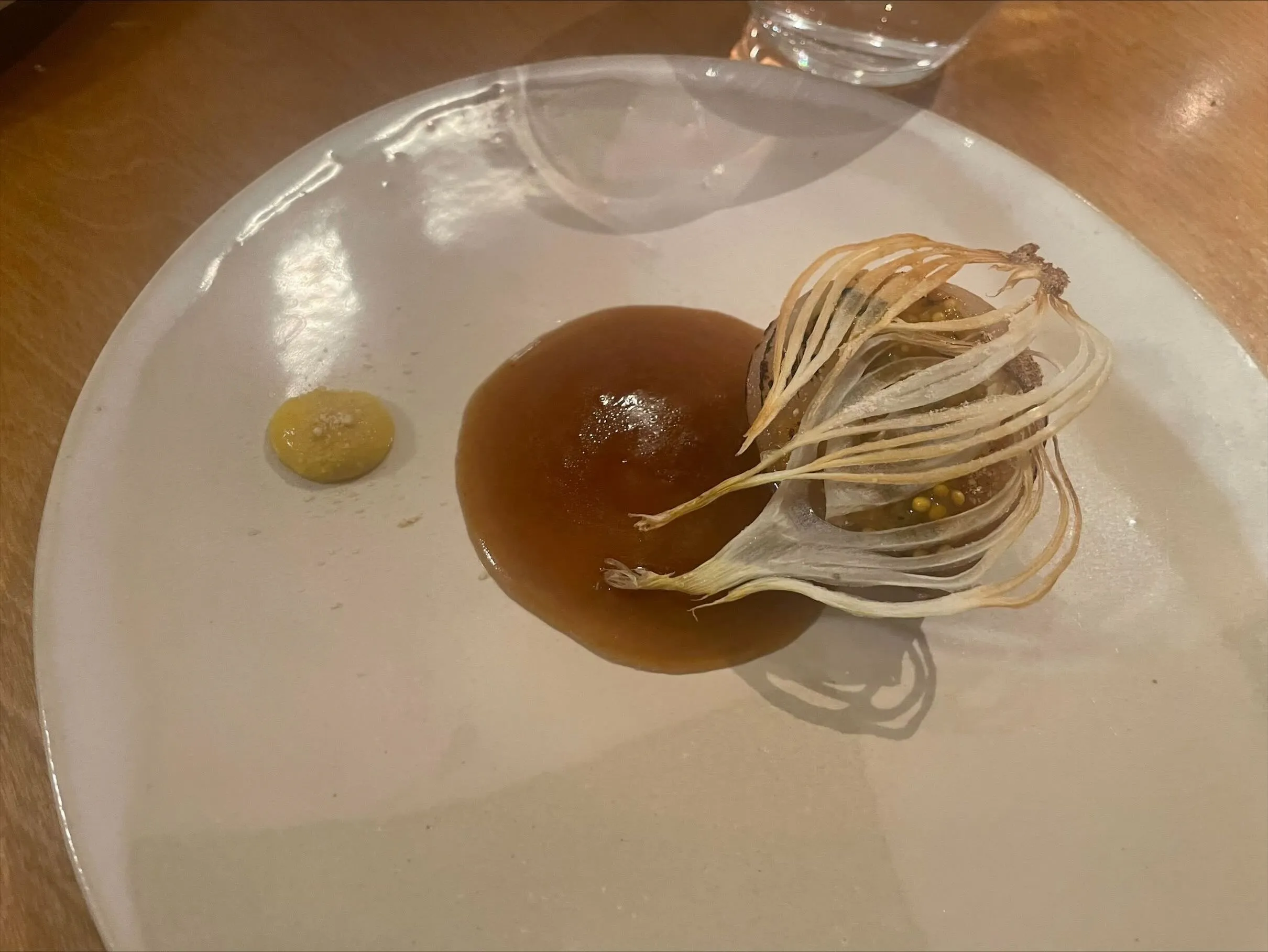 A Roscoff onion with an onion reduction and spicy yuzu mustard raises the level considerably. The wonderfully deep onion flavor is cut by the spiciness of the mustard and the complex acidity of the yuzu, with some fried onions on top for texture. An well-executed, reduced plate that is sharply focused on highlighting the qualities of its main protagonist, the onion. (8/10)