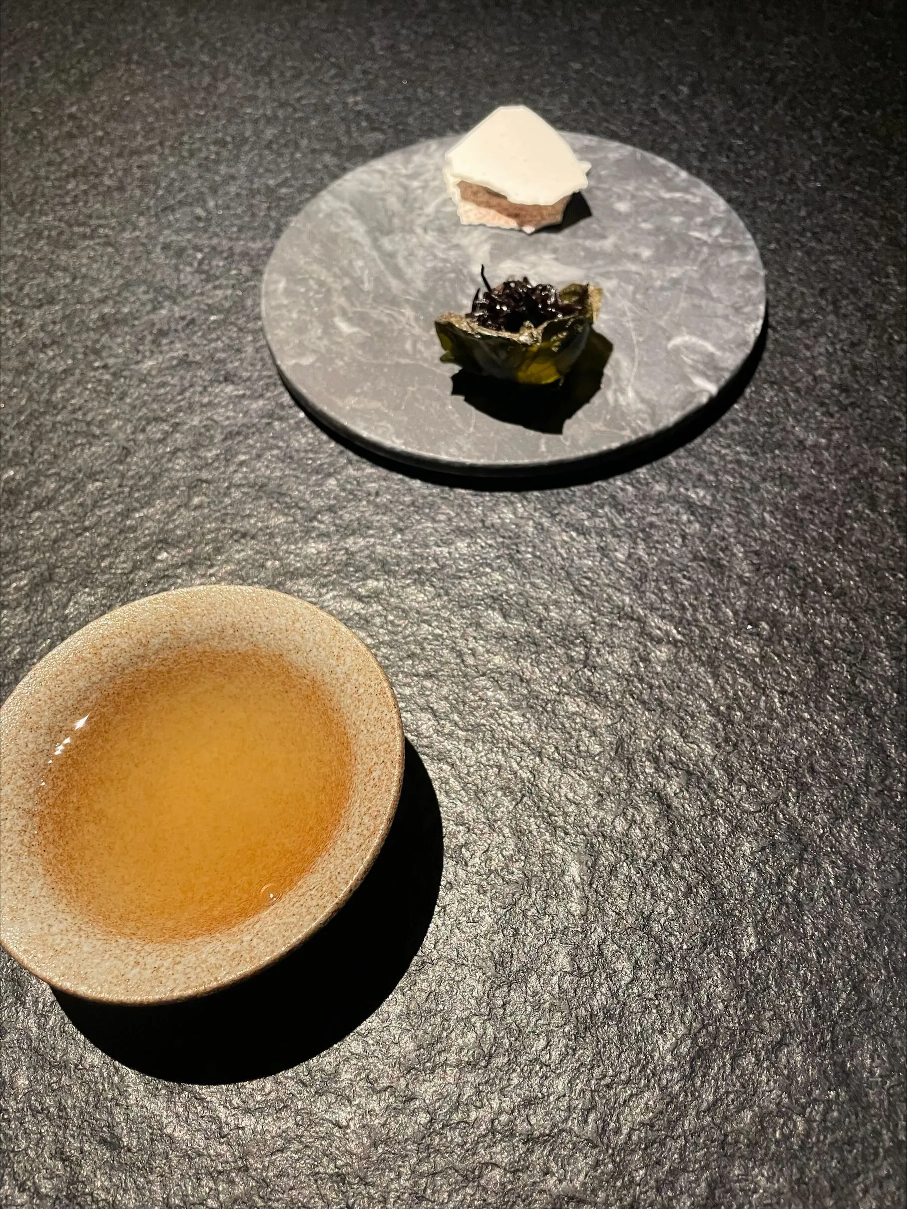 The first snacks, a filled algae crisp and a chickpea meringue, do little to spoil the mood. (7/10) A cold herbal tea served alongside is interesting, but a bit bland.