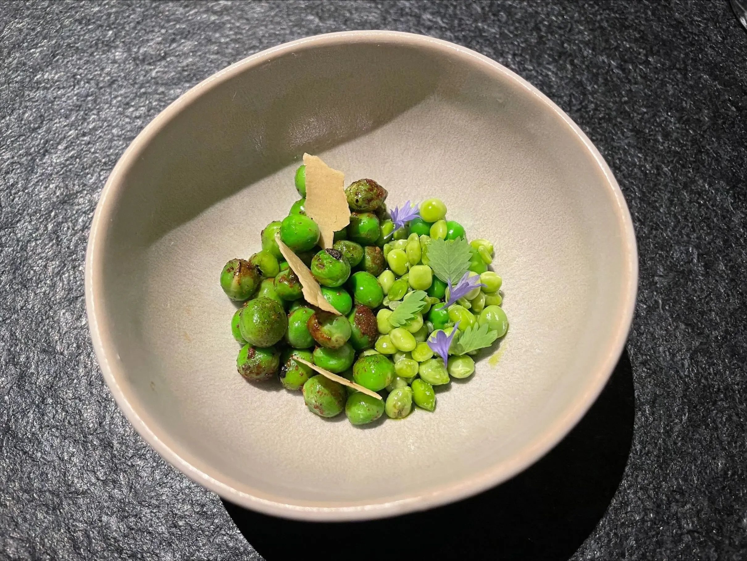 The first course is all about peas: on the left, they come grilled with yeast spice powder and on the right blanched with dashi vinegar. The grilled ones have an excellent spice powder, though they are a little starchy. The right ones are absolutely perfect. (7+/10)