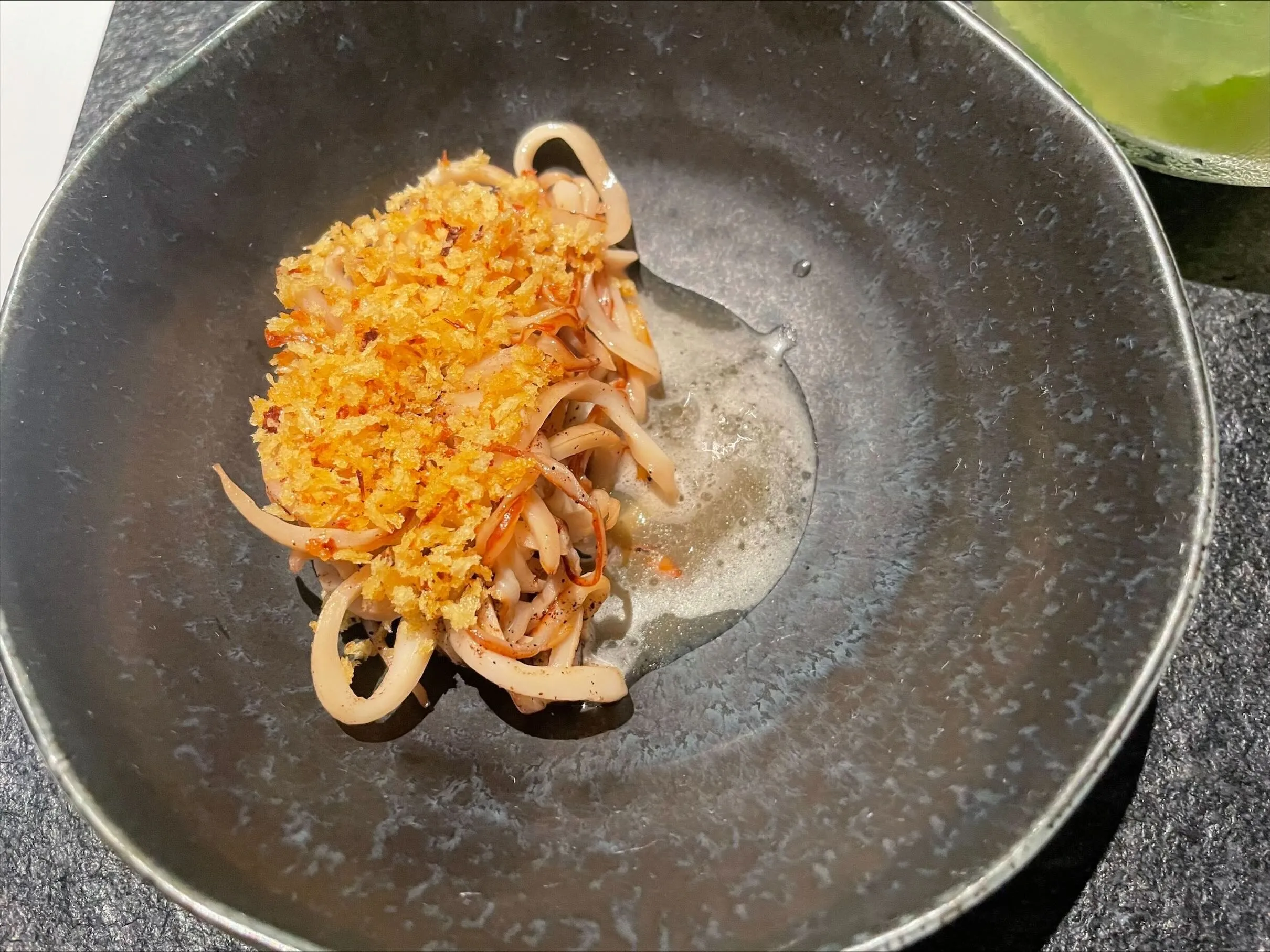 We continue with king oyster mushroom — more precisely, its stems, which have been made into a kind of pasta and are served with a mushroom broth. The depth of flavour here is amazing and a surprising amount of spice cuts through the umami. The result is a simple but perfect plate of food. (10/10)