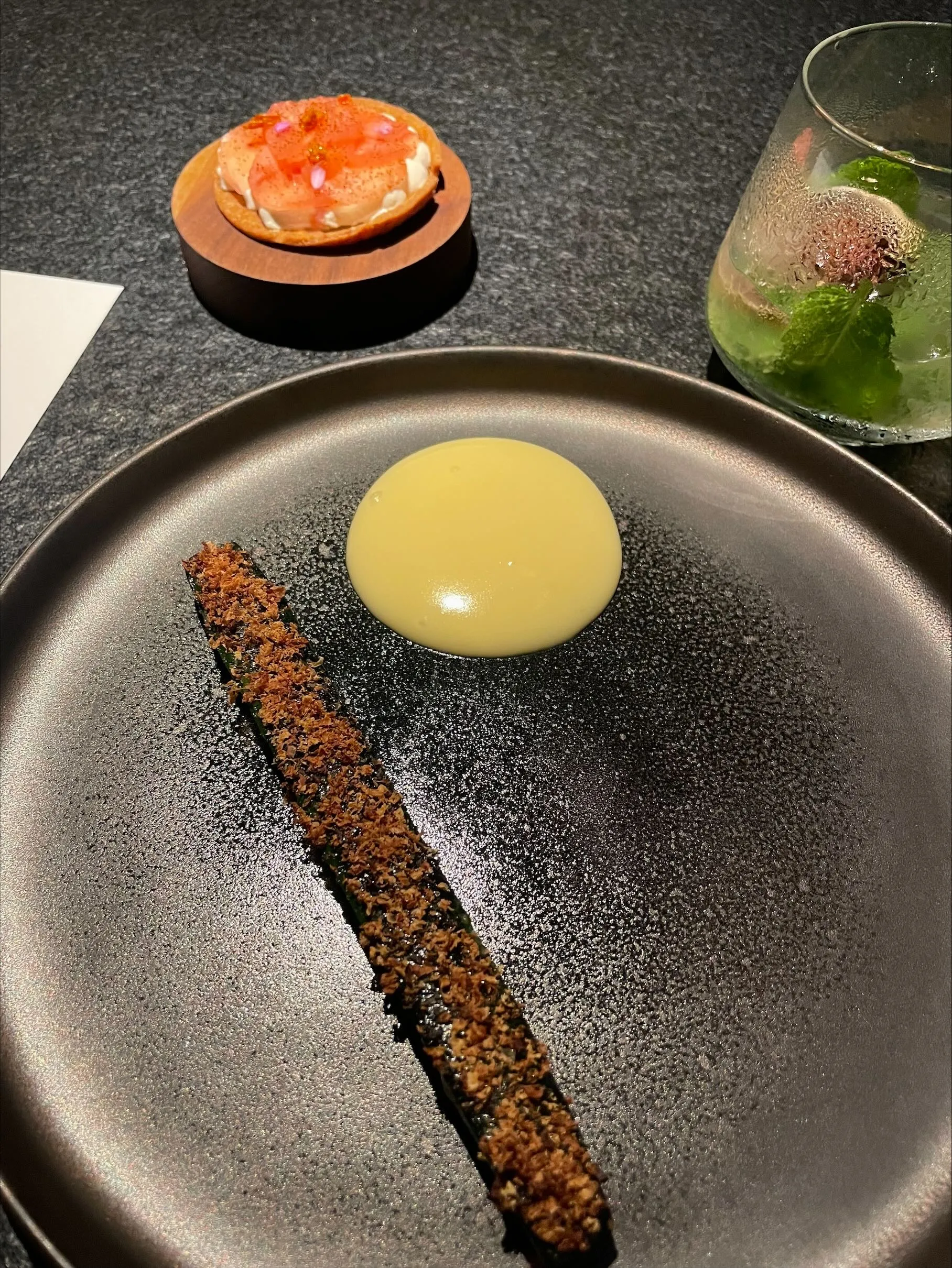 A compressed and grilled cucumber is next, served with a tartlet with green almond and pickles. The cucumber is very good, as is the tartlet. The balanced and delicate flavours of these two elements are unfortunately paired with an oversized dollop of overly acidic sauce. But there’s an easy remedy: just leave the sauce on the plate, which is what I do. (7/10)