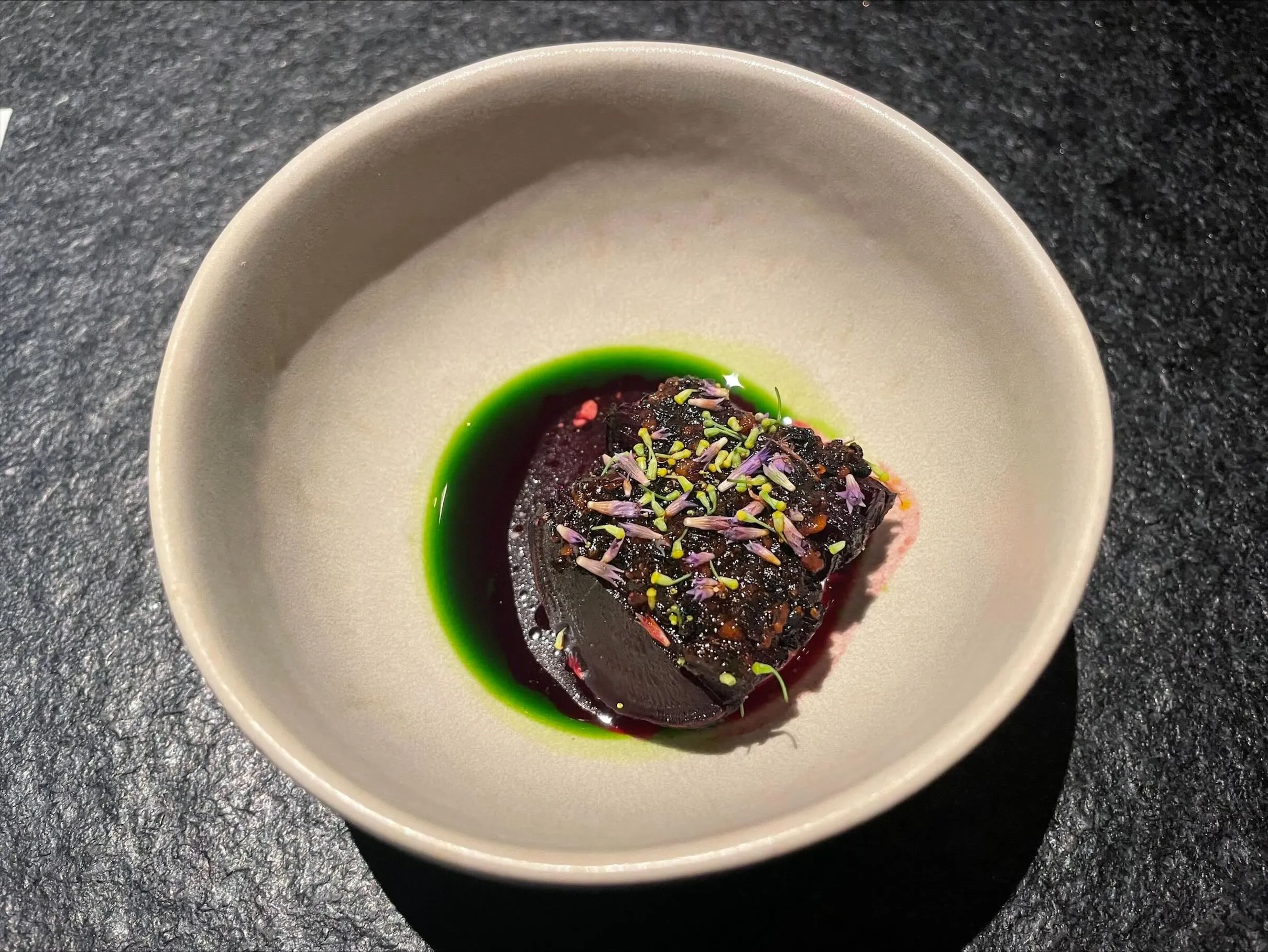 Given the stunningly high level of the menu so far, I opt for an extra course (15 Eur) of beetroot with, well, many things, which I failed to note down. It’s served with linden flower oil. The result is complex, delicious, superb. (10/10)