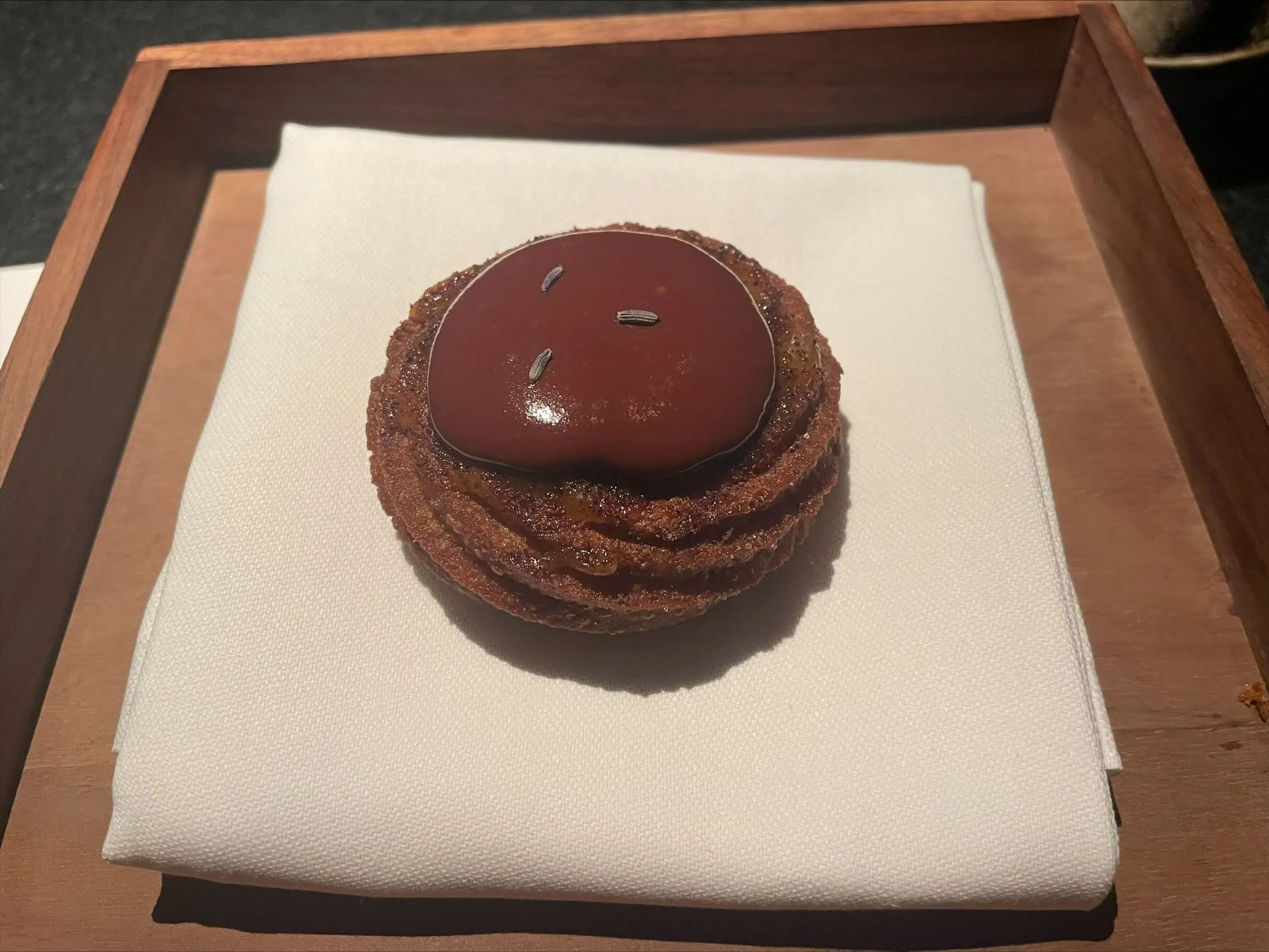 A churro filled with fermented apricot and chocolate on top (another 15 Eur supplement) is much better, but could have used more apricot. But at this point, who cares — my mind is still on those mushrooms and that beetroot. (7/10)
