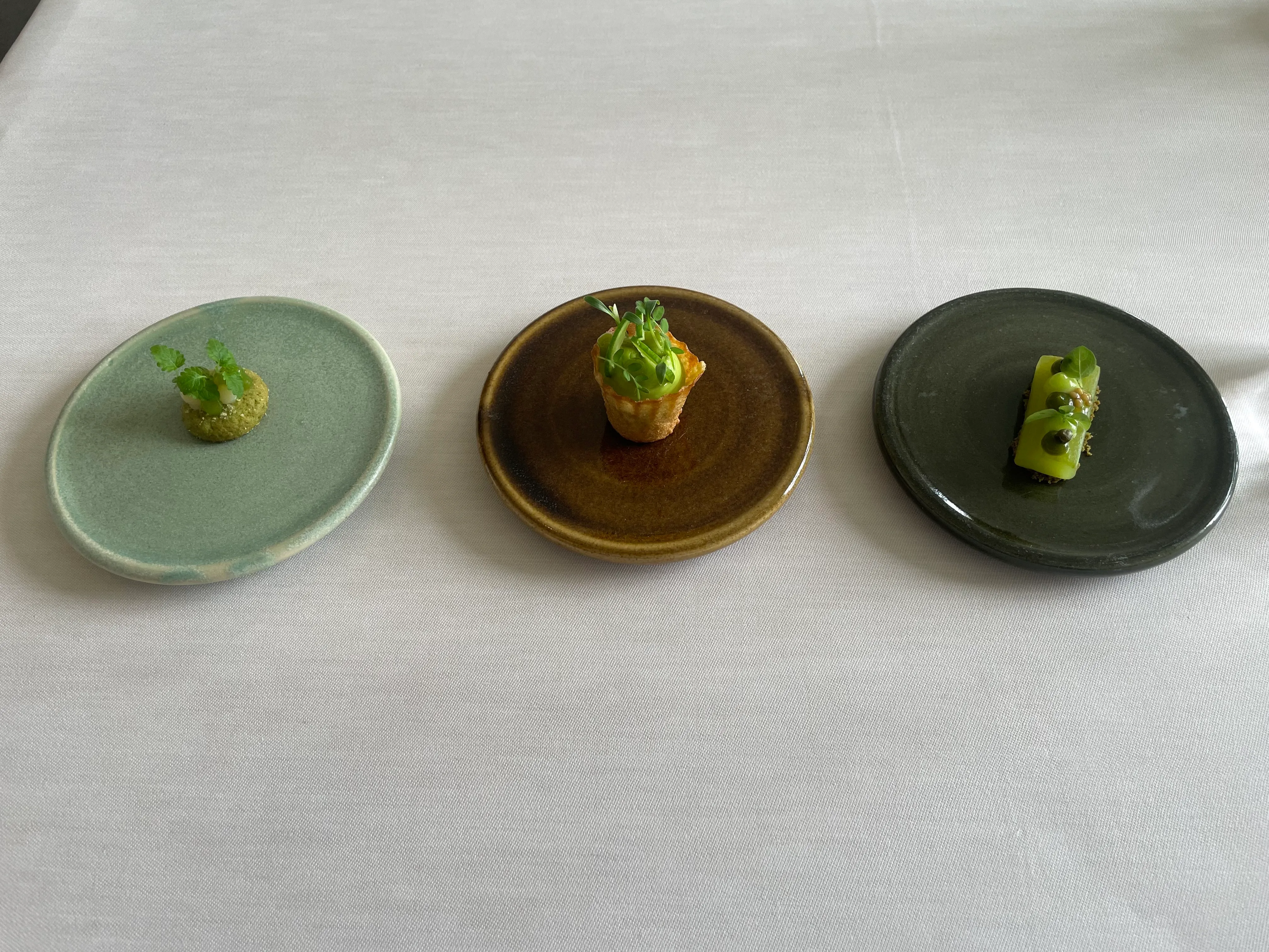 We start with a trio of cucumber-based bites: right, a pickled cucumber, in the middle a cucumber cream tartlet, and left a cucumber sable. The pickled cucumber tastes like, well, pickled cucumber of a rather ordinary kind. The tart doesn’t taste of cucumber at all, it’s a slightly acidic green cream with an otherwise undefined but pleasant taste. The sable is interesting insofar as it’s dry and crumbly, but does taste distinctly of cucumber, a taste that feels distinctly wet. Overall this is a pleasant but unremarkable start. (7/10)