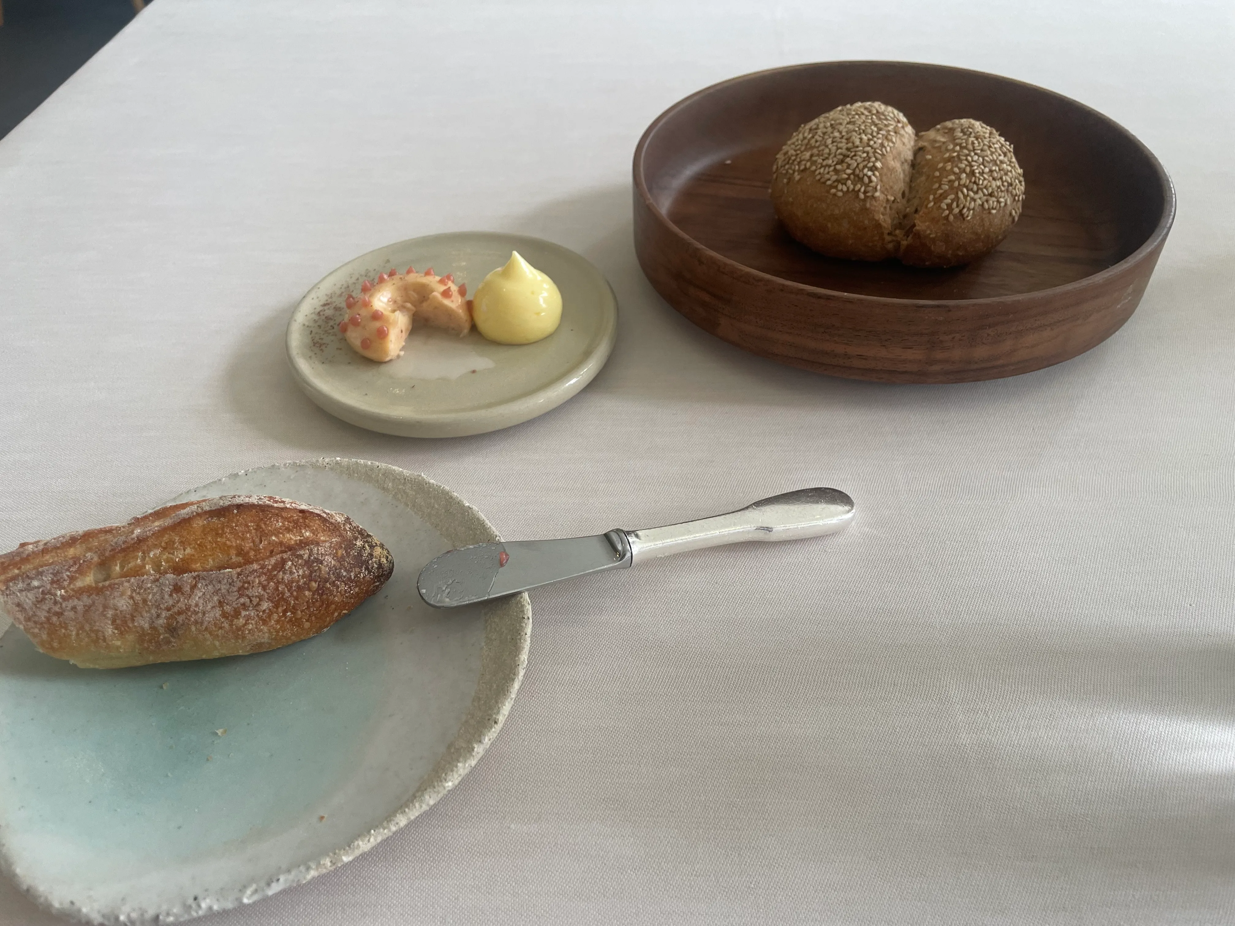 The first official course of the menu features, unusually, tofu. This is paired with fennel, sesame, and yuzu ponzu. On paper this sounds excellent: high quality (especially silken) tofu can be excellent, and I love fennel. On the plate, it’s much less excellent: mediocre tofu is left raw and unmarinated, the fennel has very little taste, so overall the only noticeable taste is that of the yuzu ponzu, which tastes fairly average and not much of yuzu. (6/10)