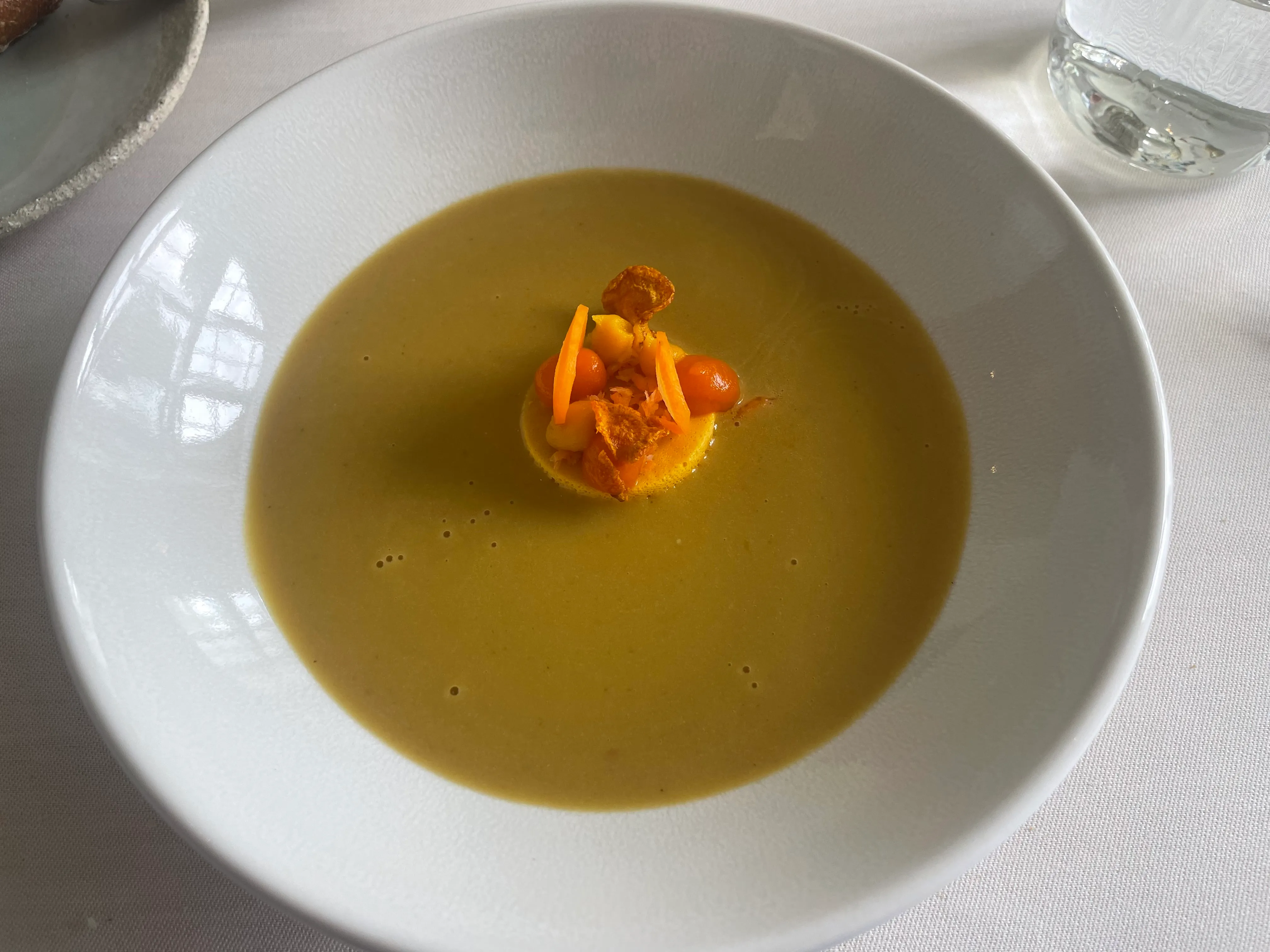An artful tower of carrot based preparations arrives. The soup covers this beautiful arrangement and only leaves a little carrot island in the middle. The soup tastes of lemongrass, curry powder, and disappointment. It does not taste of carrot. Neither does the little flan in the middle, which tastes of nothing at all. The problem with the menu so far is exemplified in the carrot garnish on top: raw slices of carrots are the only natural element of the plate, but they taste like supermarket carrots, the ones I used to buy, before I discovered the better ones on the little tray. The focus here seems to be on complicated preparations, not high quality raw materials. (6/10)