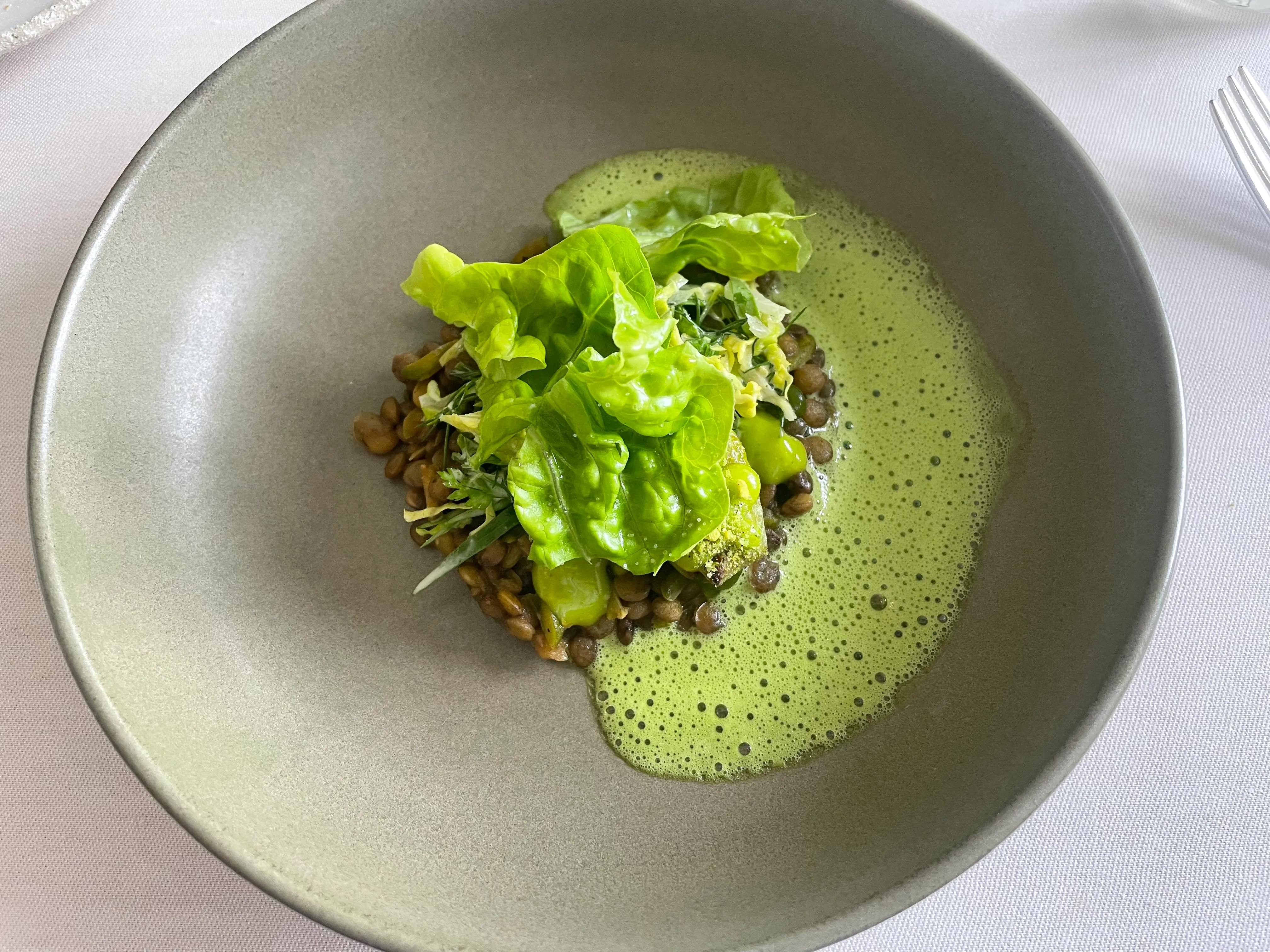 The next course features lentils, another ingredient rarely seen in fine dining restaurants, but one that can be undoubtedly delicious. These are not. They’re undercooked, oversalted, paired with an inconsequential pistachio beurre blanc (where the pistachio contributes little except color) and topped with various greenery. It’s the smallest portion of lentils I’ve been served in my life (the photos are deceiving because all the plates were unusually small), and one of the first I don’t finish. There’s also a piece of bay leaf flavoured leek, which is drowned out by the saltiness of its platemates. (6/10)