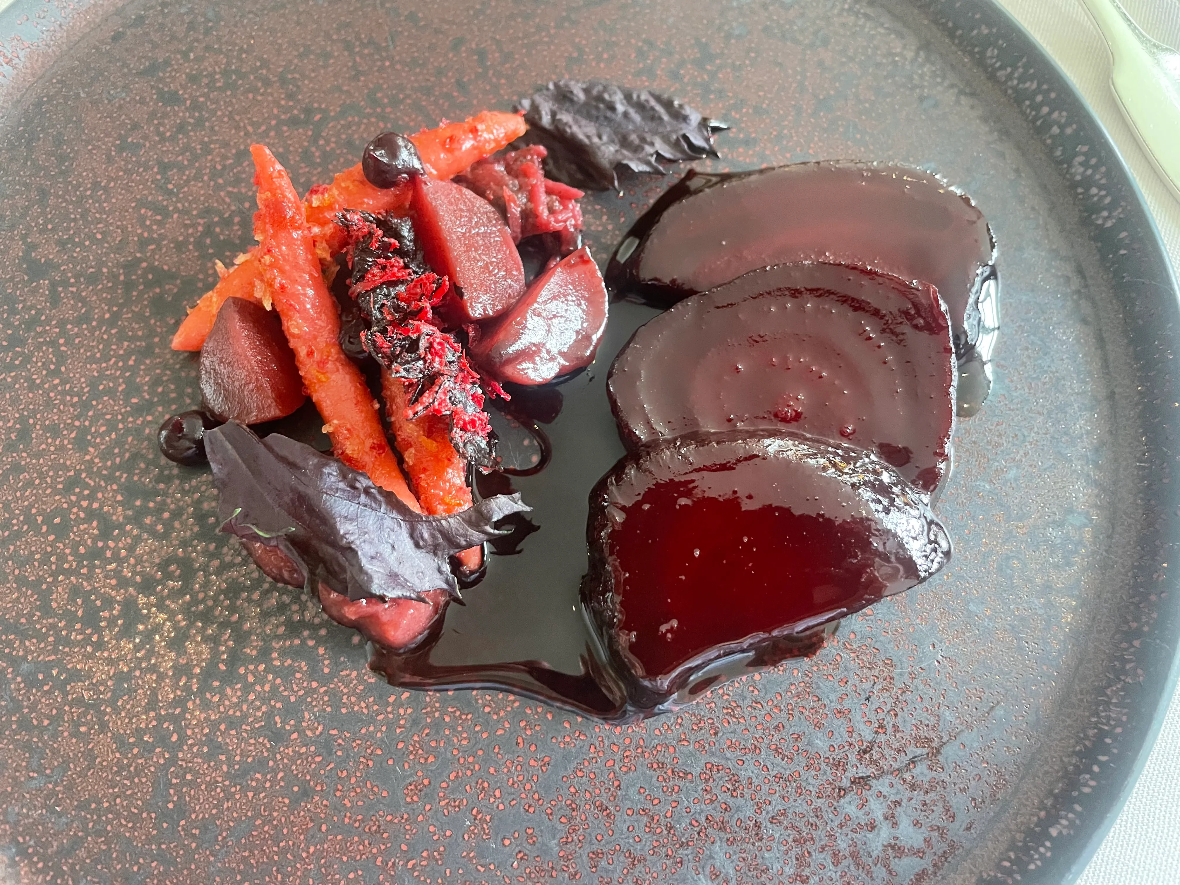 Alas, the dessert in the previous course was a ruse: we’ve only now made it to the main course, which consists of beetroot with shiso Schupfnudeln and Langpfeffer glaze. Or maybe we’re still in the dessert section, because the glaze is tooth achingly, absurdly, horribly sweet. The other ingredients don’t stand a chance. (5/10)