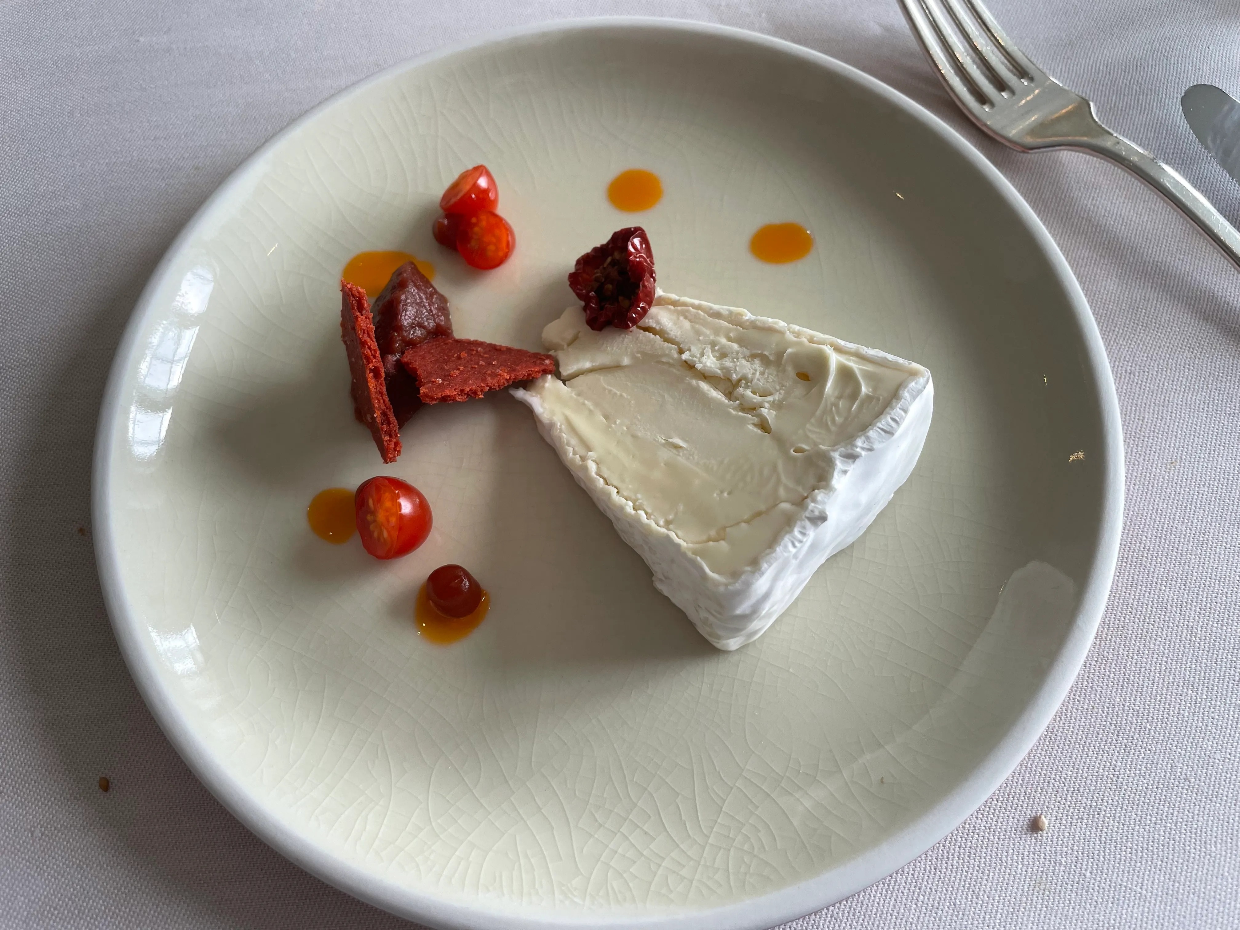 A nice piece of Brillat Savarin is served with various forms of tomato. These are, on the whole, good, except for a horrible dried tomato that I make the mistake of trying to eat. (6/10)